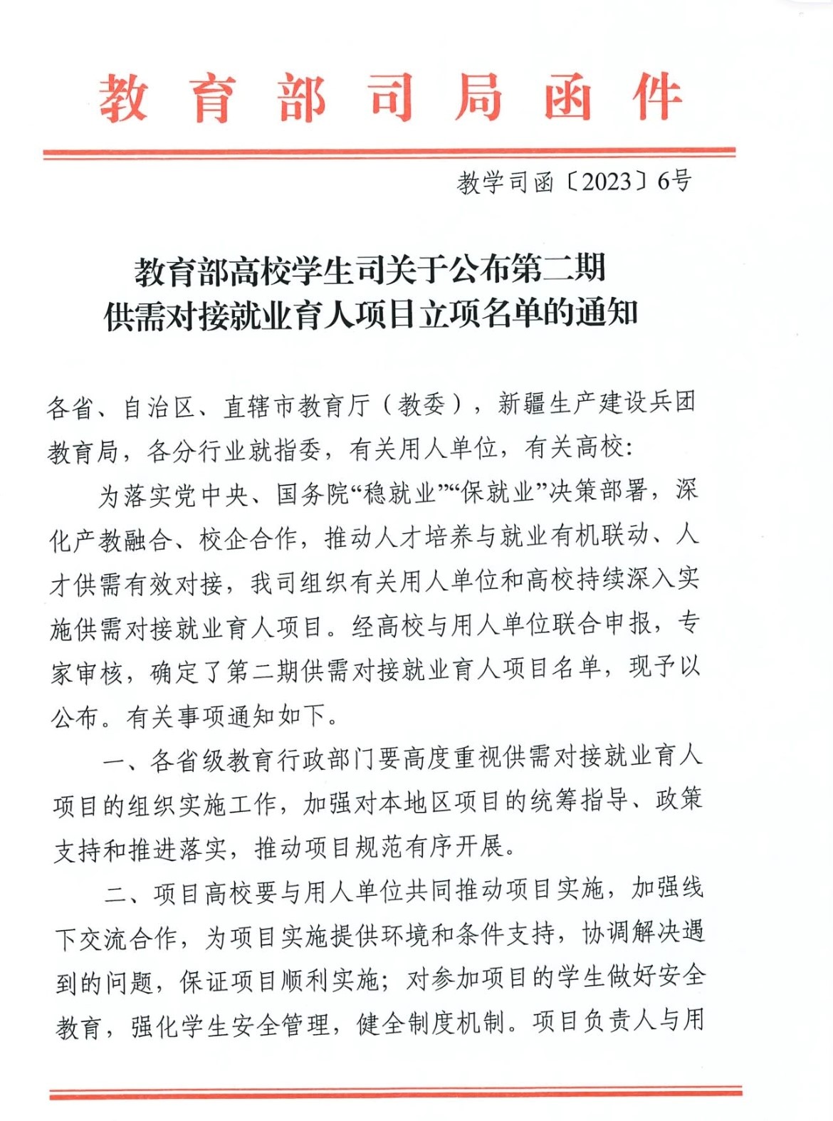 近日,教育部高校学生司公布《教育部高校学生司关于公布第二期供需对接就业育人项目立项名单的通知》(教学司函〔2023〕6号),经济与人文学院3个项目获批立项。