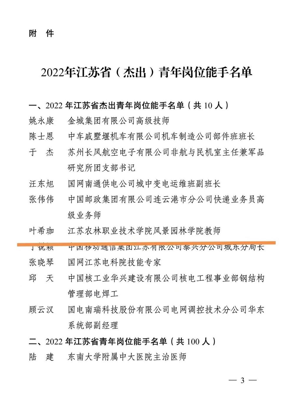 为深入学习贯彻习近平总书记关于青年工作的重要思想、关于人才工作的重要论述,激励广大青年立足岗位、创先争优,近日,团省委联合省人社厅开展2022年江苏省(杰出)青年岗位能手评选认定工作。永利官网风景园林学院教师叶希珈荣获“江苏省杰出青年岗位能手”。