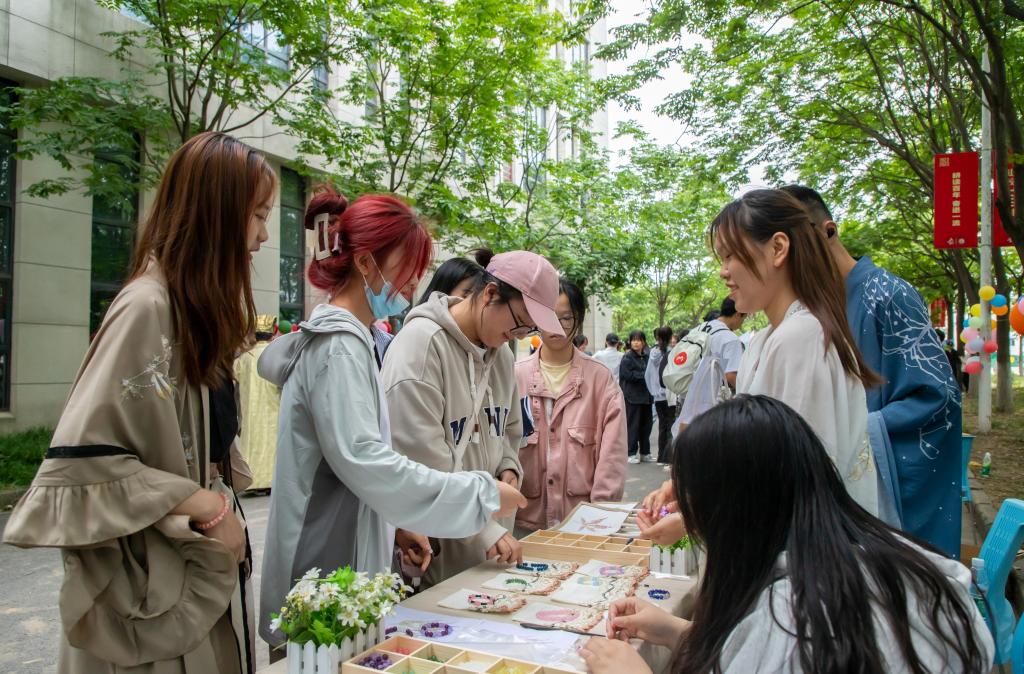 一袭华衣,灼灼其华,游园会在《桃花笑》汉服表演拉开帷幕。现场,同学们玩蹴鞠、抽陀螺、投壶、飞花令等一系列“童趣”活动,参与者完成闯关便可获得定制“铜币”,收集到一定数量后,可在旁边的“国风文创集市”上参与抽奖或“购买”古风小礼品等。拍照打卡、游戏“赚钱”、观看表演,同学们玩得不亦乐乎。活动持续近四个小时,同学们意犹未尽,久久不愿散场。
