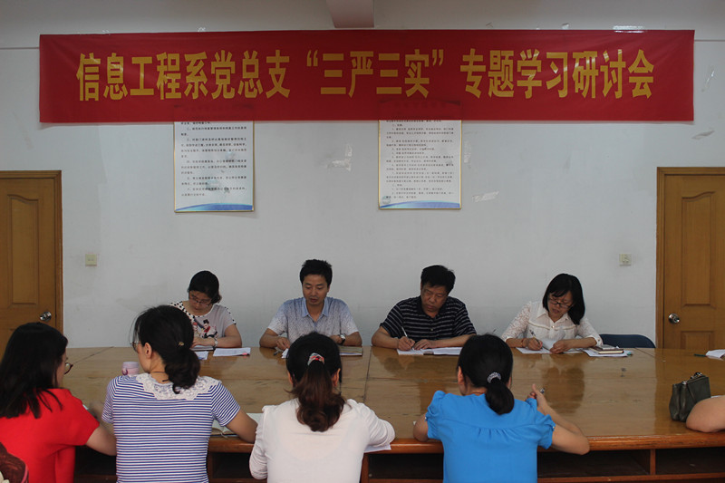 6月24日下午,信息工程系党总支召开了“三严三实”专题学习研讨会。院工会主席江德明出席会议,系部全体教师党员参加了会议。会议由信息工程系党总支副书记汪建春主持。