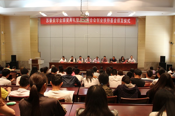 5月16日下午,苏豪奖学金颁奖典礼暨名企联合会创业扶持基金颁发仪式在研发楼报告厅举行。江苏苏豪国际集团股份有限公司总经理贾仲伟、南通盈康农业旅游发展有限公司总经理顾永贤、江苏临溪农业发现有限公司总经理朱云飞、上海荣邦投资管理有限公司总监赵婷及院团委、就业指导、农学园艺系等相关老师出席了本次会议。