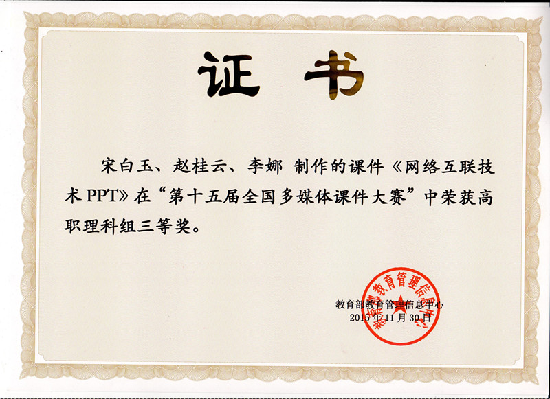 近日,教育部教育管理信息中心下发《关于公布第十五届全国多媒体课件大赛获奖名单的通知》(教信息中心[2015]80号),经过教育部教育管理信息中心评审专家初审和复审,赵桂云、宋白玉、黄超、胡晓进四位老师制作的多媒体课件《数字电子技术》荣获高职理科组优秀奖;胡晓进、潘蓉、黄超、王小丽、宋白玉、赵桂云六位老师制作的多媒体课件《模拟电子技术》以及宋白玉、赵桂云、李娜三位老师制作的多媒体课件《网络互联技术PPT》荣获高职理科组三等奖。