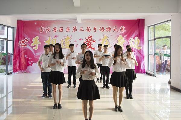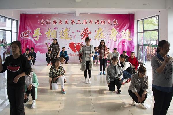 4月13日下午,由畜牧兽医系分团委心育部主办的“心手相连 爱在身边”第三届手语操大赛在研发楼一楼大厅拉开帷幕。全系近500名同学组队参加了比赛。 比赛中,同学们伴随着一曲曲励志向上的歌曲,将感情与意境相融合,肢体语言与心理情感相协调,用优美的手势、多方位的队形变换流露出了真挚朴实的情感,博得在场师生的阵阵掌声。 本次手语操大赛展现了牧医学子青春、健康、向上精神状态,强化了集体观念,在丰富学生校园生活的同时,更提高了学生的综合素质。