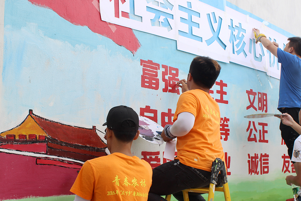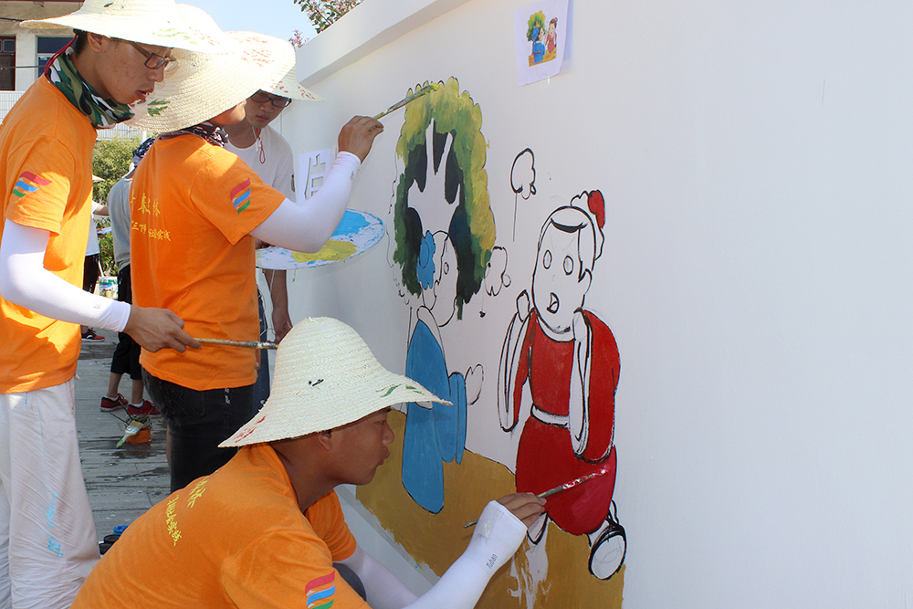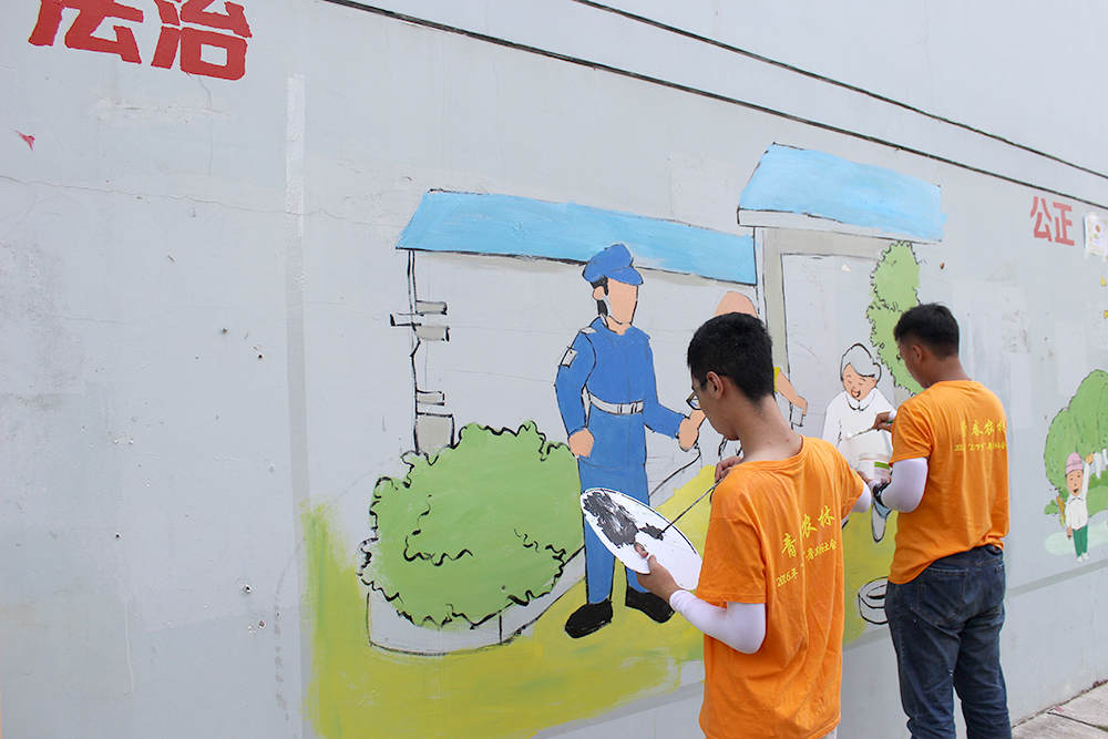 在天王镇戴庄村、浦溪花园安置小区、金山村文化广场等地,师生们通过漫画、彩绘、书法等艺术手法,开展了手绘乡风明德文化墙活动,将社会主义核心价值观、礼仪廉孝、自然生态、村庄文化、文明标语等内容图文并茂、生动形象地展现在群众面前,扮靓美丽乡村,绘画总面积达1000余平米。