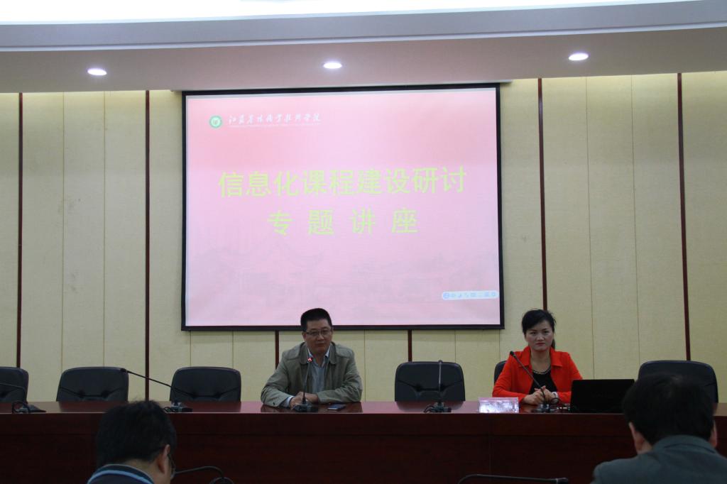 讲座中,王新燕院长分别从互联网+对现代教育的影响、网络化教学资源路径、专业团队建设、体会和感想等四个方面阐述了信息化课程建设的特点和未来趋势,同时,她结合自己所在学院的实际情况,分享了自己团队在建设信息化课程建设过程中积累的成功经验,提出课程建设重在设计的理念,给大家以启示,赢得在座老师的阵阵掌声。讲座结束后,王新燕院长与参会教师还进行了现场交流。
