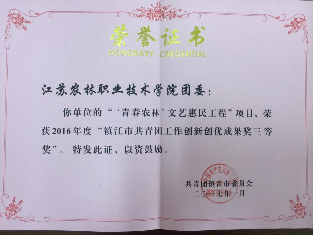 永利官网团委副书记杨春梅荣获2016年度“镇江市共青团工作先进工作者”荣誉称号,由永利官网团委申报的“‘青春农林’文艺惠民工程”项目,荣获2016年度“镇江市共青团工作创新创优成果三等奖”。