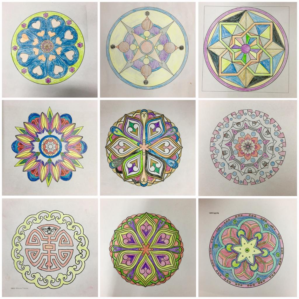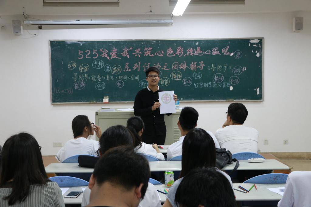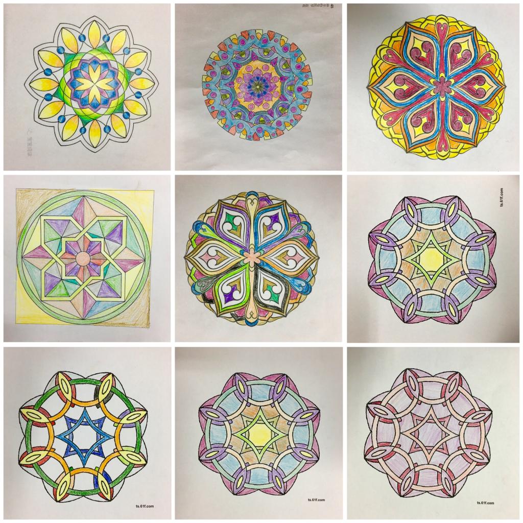 在场的同学分为五个小组,每位同学选取了自己喜爱的曼陀罗样式,在给定时间内根据内心感受赋予它们一定意义,并给这些图案上色。在同学们都完成了独属于自己的曼陀罗画作之后,主持人请同学们进行展示,并分享画作创作的想法。主持人引导同学从画作转移注意力关注自己的内心,同学们也很自然的开始倾吐自己的烦恼困惑。交流的过程中,进一步加深了在场同学对自我的了解,也学会与他人更好的沟通交流。