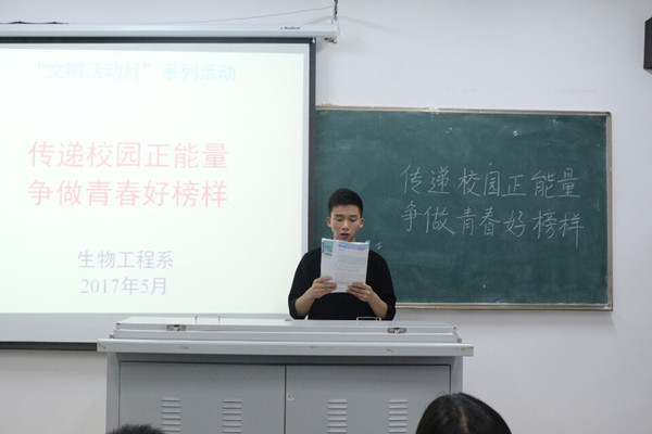 为培养学生校园文明意识和良好习惯,纠正校园内不文明举止,生物工程系自律部与4栋服务站近日开展“传递校园正能量 争做青春好榜样”文明活动月系列活动。