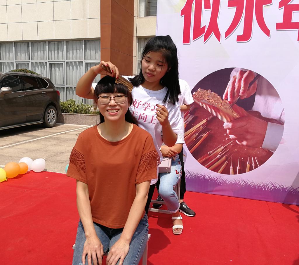 教师一捧真心育桃李,学生感念于心永铭记。活动中,八位志愿者同学在谭木匠专业人员的培训下正式上岗。同学们将对老师的爱浓于手中木梳,为辛劳的老师认真梳理头发。通过为老师梳头,帮助老师健脑聪耳、散风明目,祝愿老师身体安康。