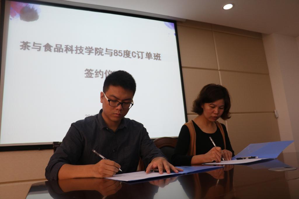 9月27日,茶与食品科技学院“85℃班”签约仪式在综合楼7楼会议室举行,茶与食品科技学院相关领导和和夏(南京)餐饮管理有限公司负责人张望参加了签约仪式。会上,双方就85℃订单班的合作形式、培养方案、奖学金管理办法等事项进行了进一步的交流。