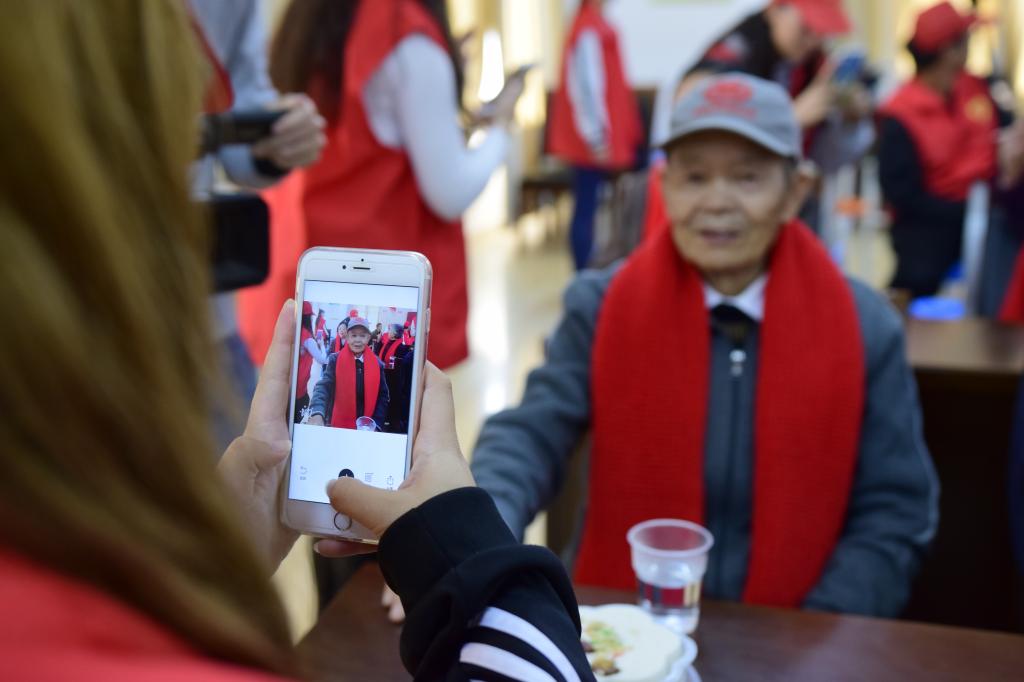 本次活动由针爱行动、“礼”敬老人、重返“十八岁”、 爱驻夕阳、点赞十九大五个环节组成。在针爱行动环节中,志愿者为爷爷奶奶们戴上他们亲手织的围巾,希望他们在寒冬里,身体和心灵上都能获得一份温暖;“礼”敬老人环节中,志愿者们身着汉服,模仿古时的礼仪以小辈的身份向长辈行礼并送上了重阳糕,送上了自己最真挚的祝福;重返“十八岁”环节中,志愿者们利用新颖的拍摄软件为老人们拍摄“萌照”,拉近老人与年轻人之间的距离;爱驻夕阳环节中,志愿者们载歌载舞,为爷爷奶奶们呈现了一个个精彩的节目,《当你老了》、《父亲》、《魔术》、《筷子舞》、《二人转》……年轻人的无限活力与灿烂笑容深深的感染了爷爷奶奶们,他们和志愿者们打成一片,现场笑声不断;活动最后,志愿者与老人们怀着浓烈的爱国情怀,齐诵《读中国》,献礼十九大,点赞中国,希望祖国繁荣昌盛!