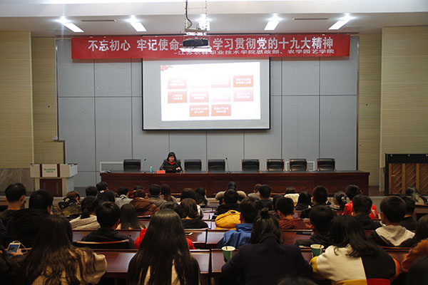 11月22日晚,农学园艺学院学生党支部邀请思政部王学红老师在研发楼报告厅举行“不忘初心,牢记历史——深入学习贯彻党的十九大精神”主题讲座。王学红老师运用视频、图片、文字等多媒体传播方式和生动形象的例子,重点阐述了十九大提出的新时代,新思想,新目标,新征程,主要矛盾新变化,新时代党的建设总要求等方面的内容,全面深刻解读了党的十九大精神实质。她强调,新时代要有新作为,要以人民为中心和以先进性、纯洁性为主线创新党建,以丰富多彩的党建文化引领事业发展,以奋斗的姿态奔赴新征程。