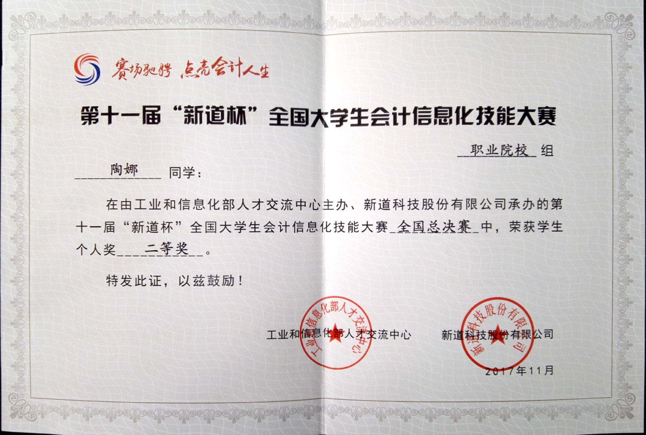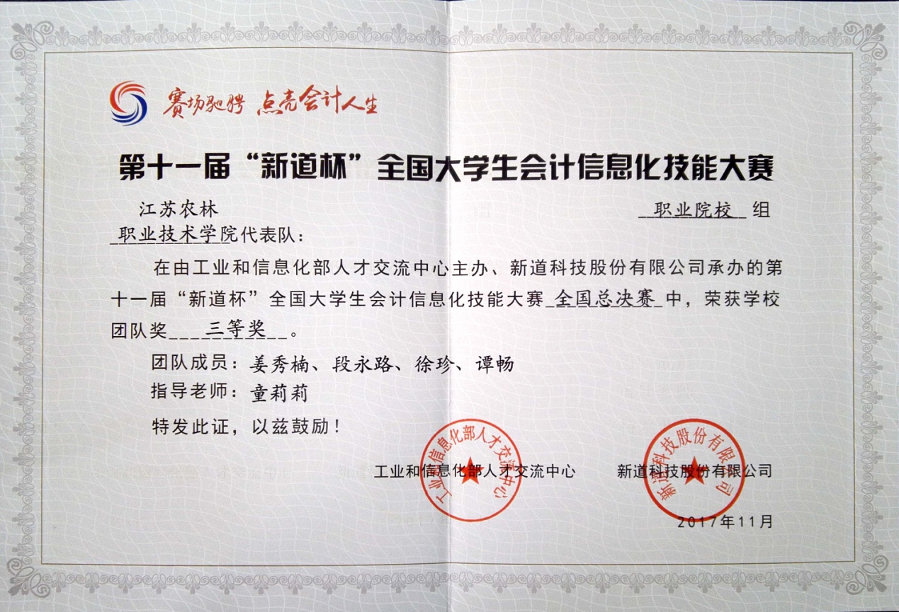 近日,第十一届“用友新道杯”全国大学生会计信息化技能大赛总决赛在江苏经贸职业技术学院 举行,我校经济与人文学院教师吴万盛、童莉莉老师带队,2015级财务管理专业8名学生组队参加。凭借稳定、出色的场上发挥,最终斩获团体三等奖,六名学生获得个人奖项,其中一个二等奖,五个三等奖。指导教师吴万盛和童莉莉获得“优秀指导教师”称号等。
