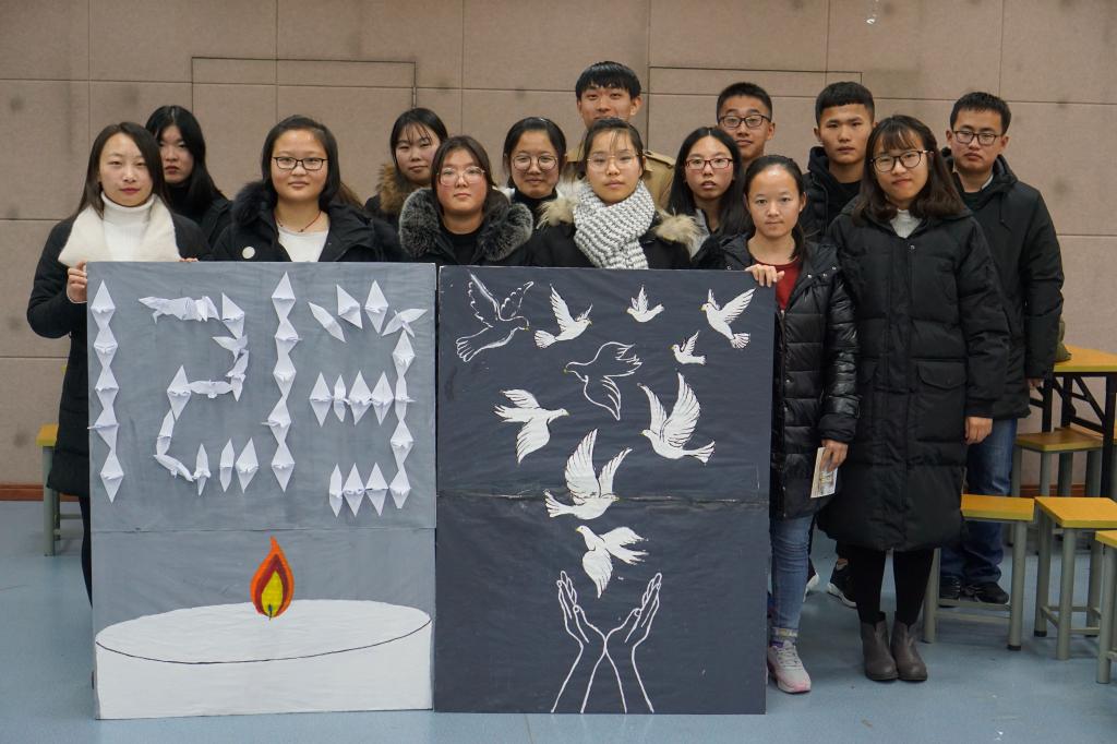 悼念活动从一段南京大屠杀纪录片及图片资料开始,同学们跟随影片和图片回顾了那段腥风血雨的历史,并集体默哀三分钟。默哀结束后,同学们一起制作了千纸鹤拼出“12.13”字样,在自制书签上写下自己的爱国决心,最后大家高举右手庄严宣誓“慎终追远,以国之名行祭之礼;以史为鉴,在历史痛感中砥砺前行!不忘国耻,振兴中华”。