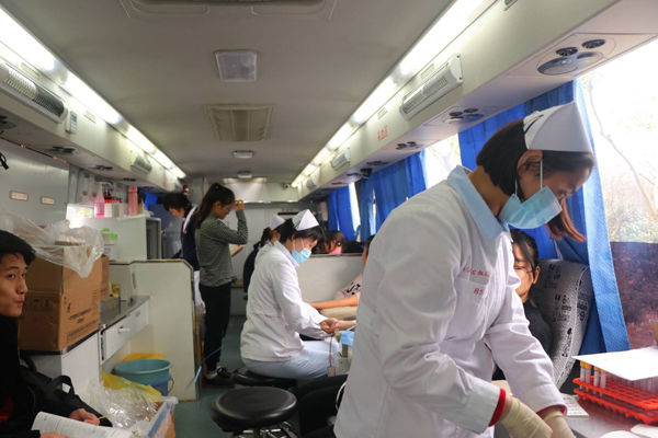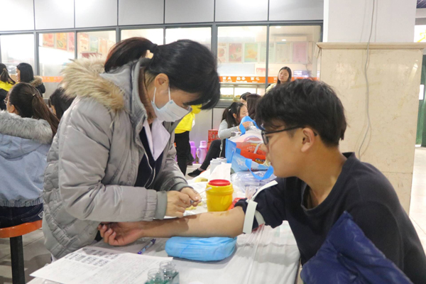 12月13日,茅山校区分团委和镇江血站在食堂门口开展了以“每一份献血都是生命的礼物”为主题的献血活动。 活动现场,不少同学已在门口排队等候。一旁的志愿者在给同学们发放资料,让他们了解献血的好处。另一旁,体检、化验、抽血、休息、等候发放无偿献血证等环节都在志愿者的协调下井然有序的进行。志愿者们为同学们送去温水和关怀的问候,爱心温暖着每一位献血的同学,一股股青春热血,一颗颗爱心满怀,使得整个活动现场的气氛达到了高潮,每个人的心里都洋溢着献血后的光荣和自豪。