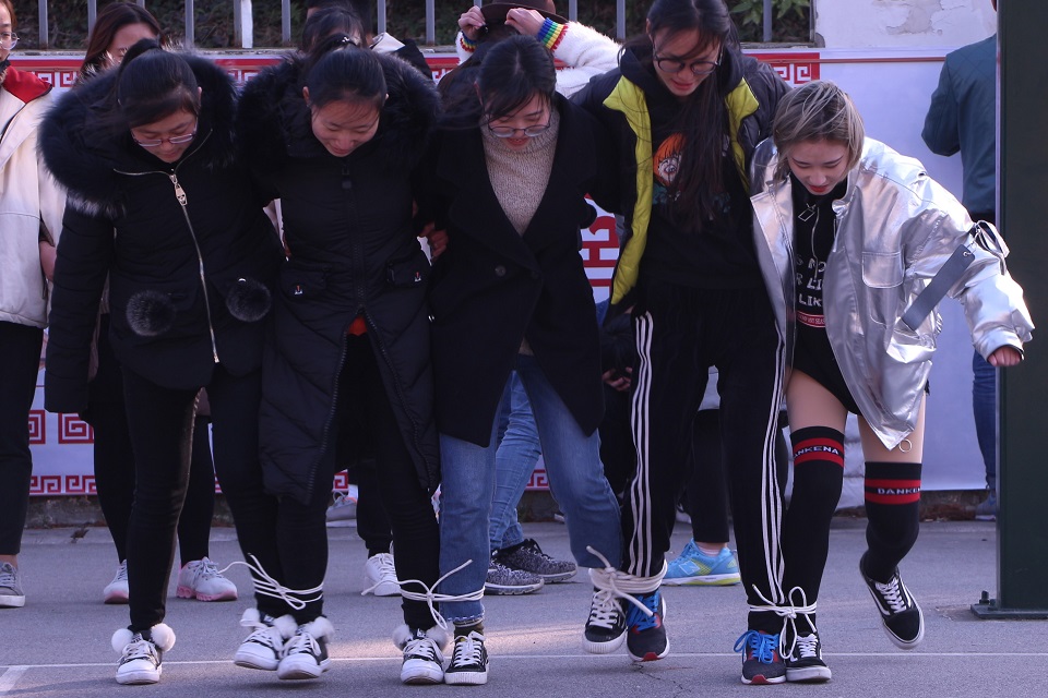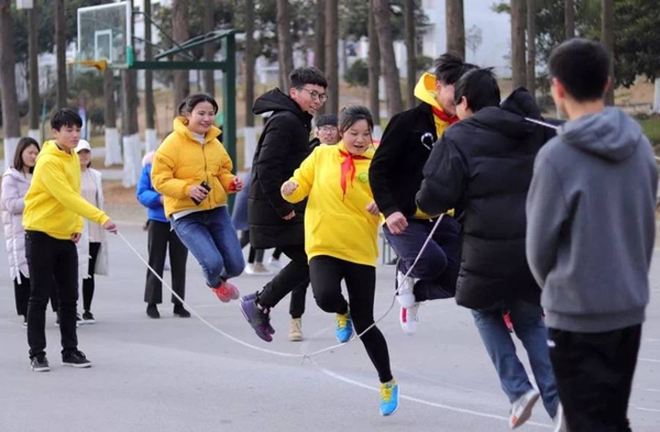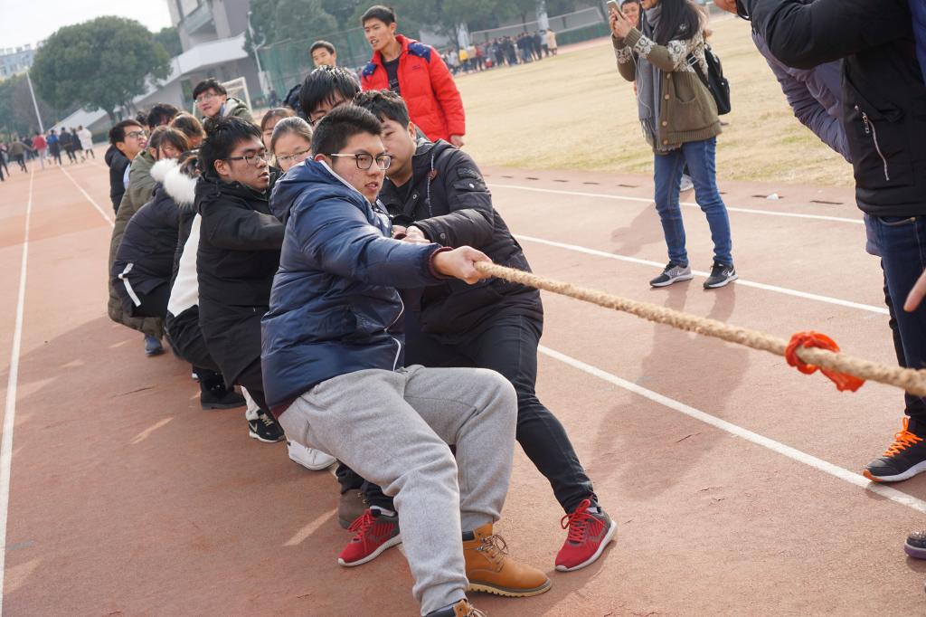 风景园林学院17级(本部)和16园林4+0八个班级的同学们在本部田径场开展了男子单摇、双摇、女子单摇、双摇班级对抗拔河、跳大绳、盲人敲锣、丢沙包、五人六足等9个传统项目的比拼,掌声、笑声、欢呼声,冬日里的校园,一派热火朝天的景象。