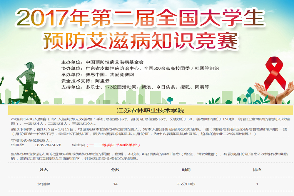 为进一步推进艾滋病防治工作,践行《中国遏制与防治艾滋病“十三五”行动计划》,由中国预防性病艾滋病基金会举办、我校畜牧兽医学院协办的“2017年第二届全国大学生预防艾滋病知识竞赛”于2017年11月1日拉开帷幕。在为期两个月的时间里,畜牧兽医学院组织全校师生积极参与,认真答题。最终,贤剑泉、田望等4位同学获得一等奖。袁梦、张盘龙等6位同学获得二等奖。陈妮、徐梅等10位同学获得三等奖。张可微、佟孝同学获得优秀组织奖,马珠林、曾令鹏等8位同学获得优秀志愿者奖。朱晓宦、赵丹两位老师获优秀指导教师奖。