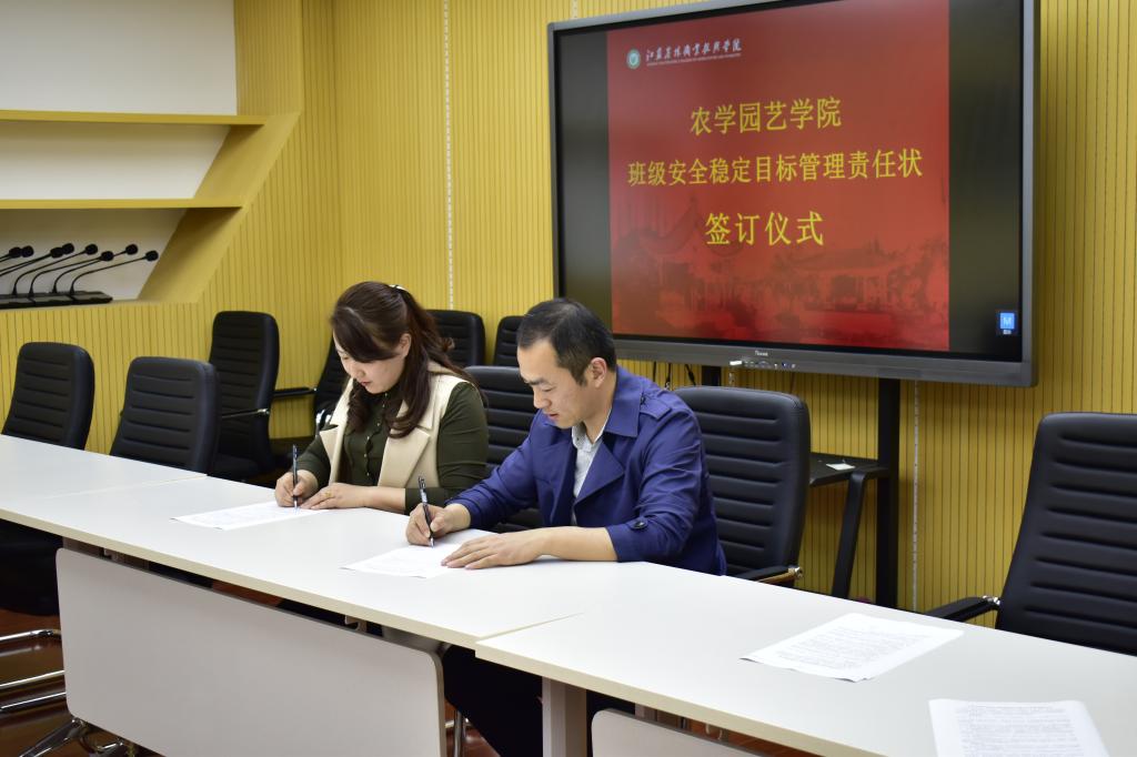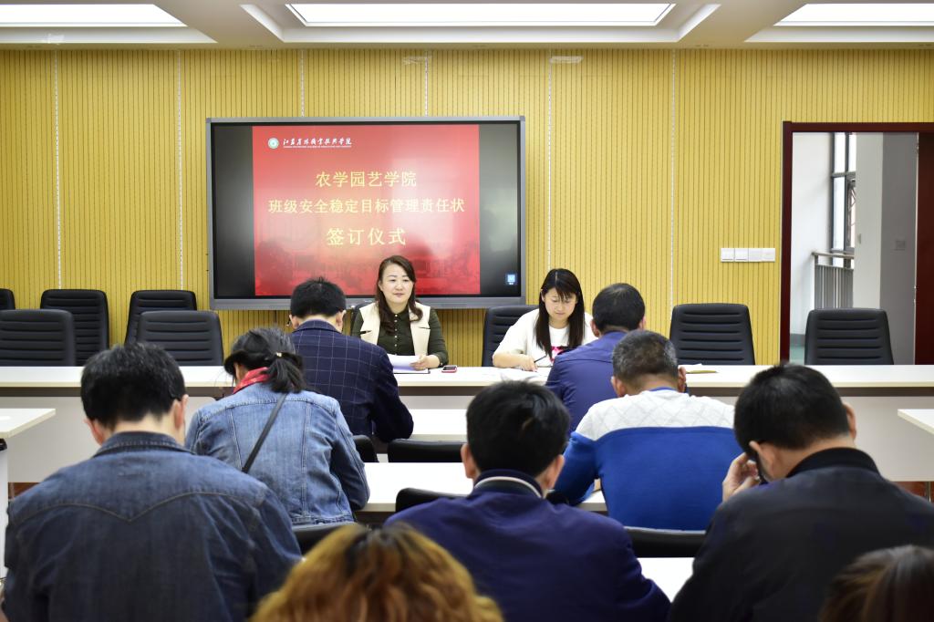 为认真贯彻学校“安全第一,预防为主”的安全工作总方针,落实学校安全防范措施,进一步明确辅导员(班主任)的安全职责及责任意识的增强,4月11日,农学园艺学院在研发楼二楼会议室举行班级安全稳定目标管理责任状签订仪式,学院党总支副书记董慧参会,并代表学院与各班主任分别签订了《77779193永利官网班级安全稳定目标管理责任状》。同时,她强调班主任们要严格维护班级安全稳定工作,一方面要加强学生人身及财产安全管理,另一方面要加强班级外出活动安全管理及毕业生的教育管理。面对突发事件,要第一时间主动到场协调,维护学生安全与利益,并及时上报上级部门领导。