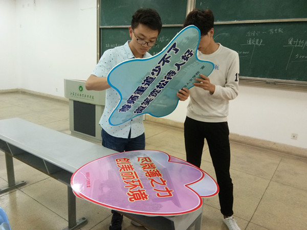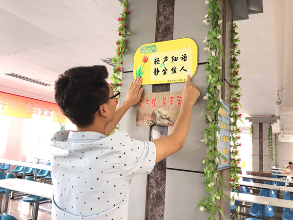 为营造文明的校园氛围, 5月8日下午,经济与人文学院分团委、学生会组织同学们在校园教室、食堂等公共场所张贴文明标语活动。