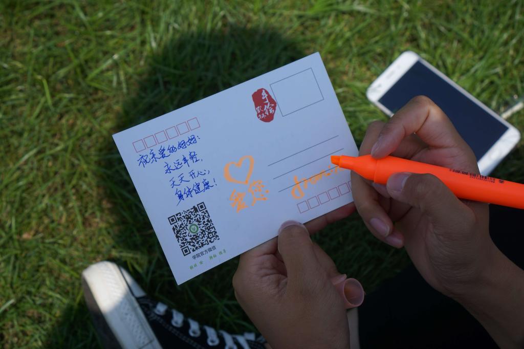 主持人请参与活动的同学围成圈席地而坐,用“你最近一次跟妈妈的通话是什么时候?”“妈妈的生日是哪天?”“有没有跟妈妈说过我爱你?”三个问题作为开场活跃气氛,接着大家自告奋勇地分享与母亲之间的“逗比”日常,现场笑声一片。同学们在手绘明信片上写下了对母亲的感恩、祝福,并在现场与母亲连线视频,借着活动契机大声地说出“妈妈,辛苦了!”、“妈妈,我爱你!”,令连线的妈妈们感动满满。