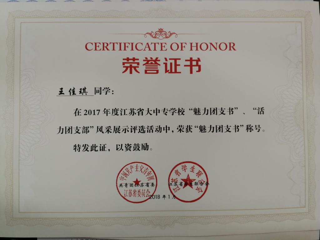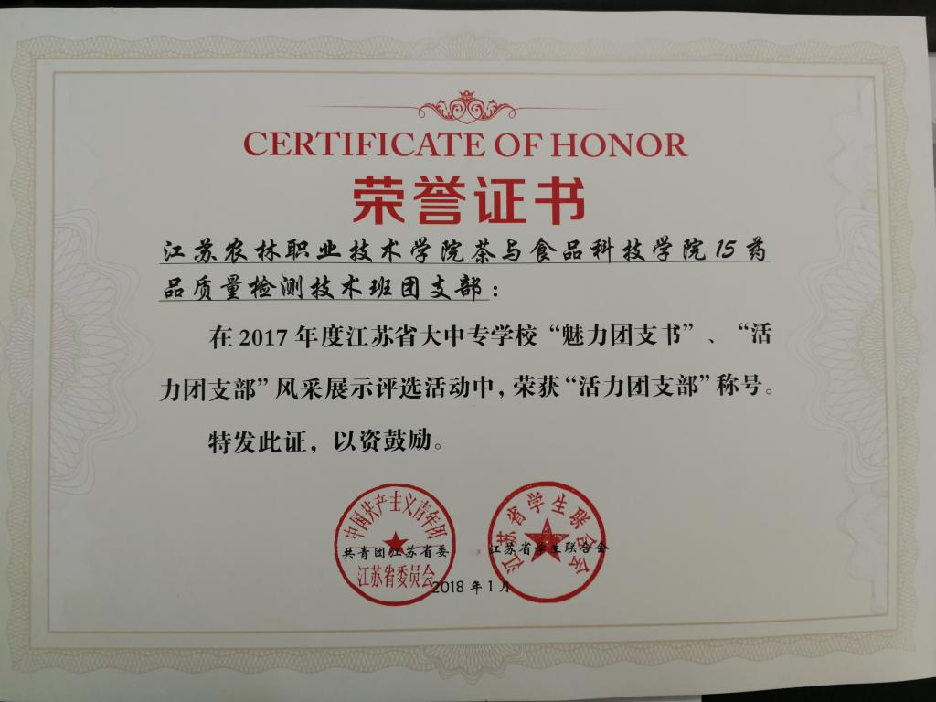 近日,为进一步提升全省学校共青团工作整体水平,团省委面向全省大中专学校举办了“魅力团支书、活力团支部”风采展示评选活动。经网络平台投票、申报材料综合评审,永利官网15药品质量检测技术班团支部被评为“江苏省活力团支部”、王佳琪同学被评为“镇江市魅力团支书”。