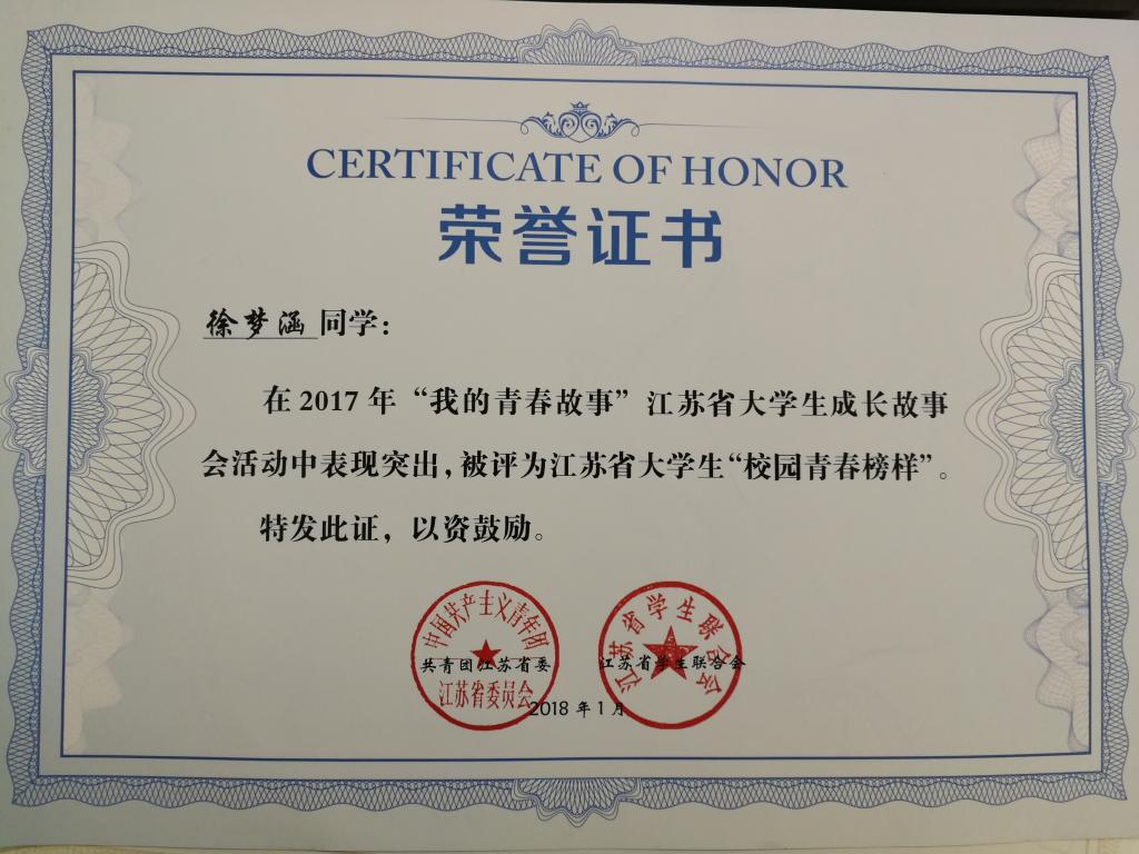 此外,永利官网徐梦涵同学,在共青团江苏省委、江苏省学生联合会主办2017年“我的青春故事”大学生成长故事会活动中表现突出,荣获江苏省大学生“校园青春榜样”称号。