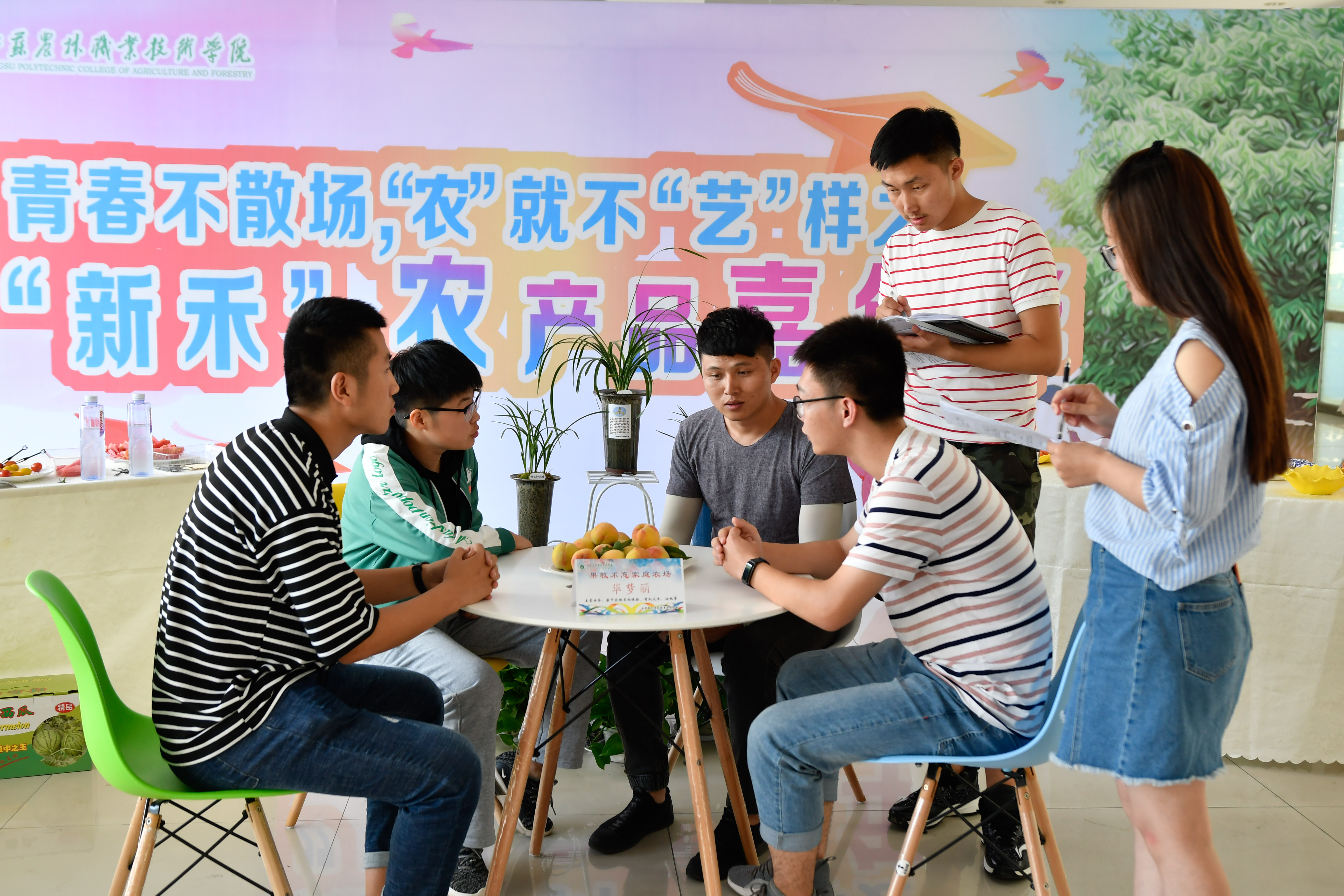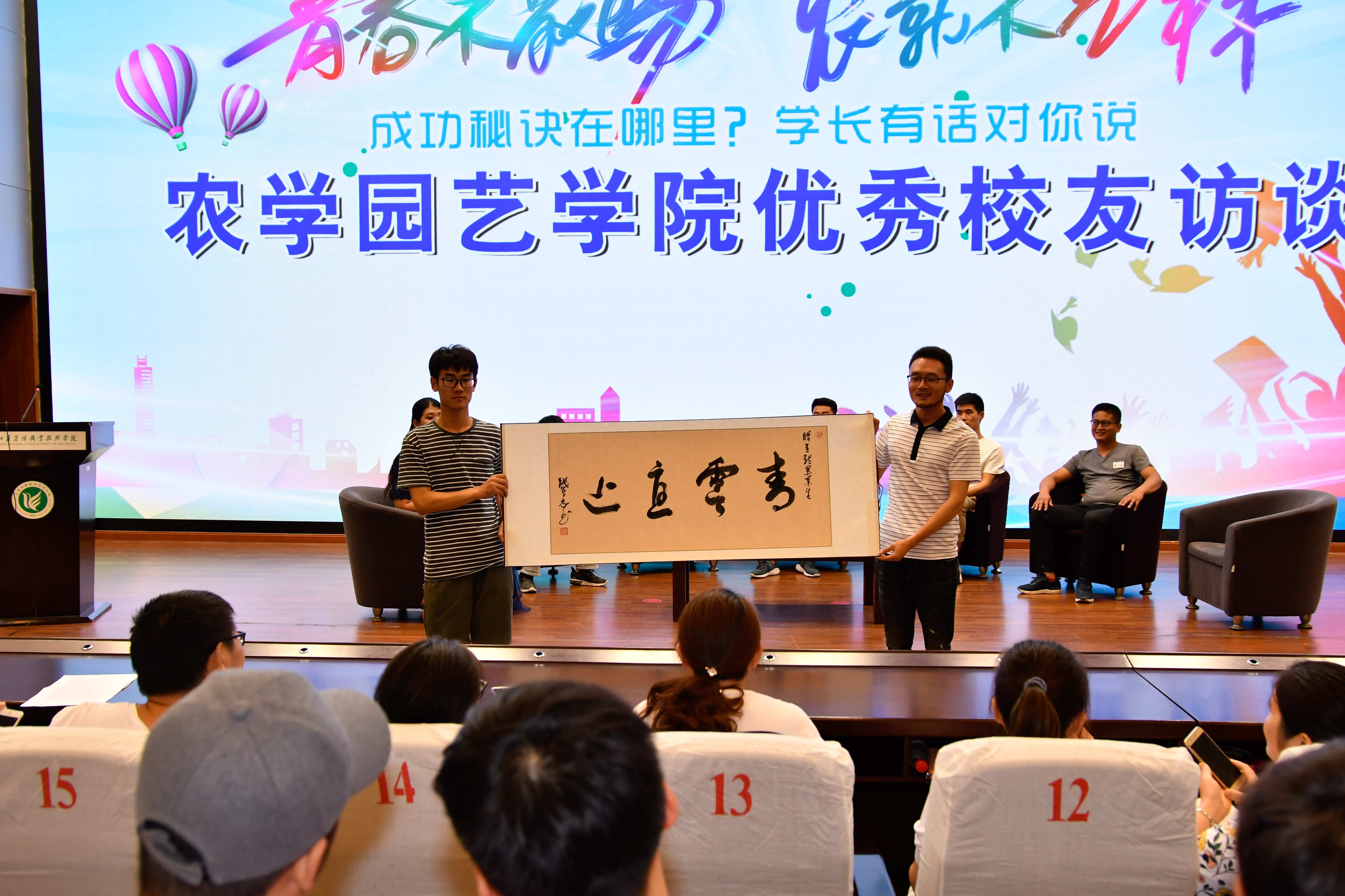 此次毕业活动分为成功秘诀在哪里?学长有话对你说”访谈环节和“新禾”农产品嘉年华展销环节。访谈中,党总支副书记董慧老师对2018届毕业生寄于了真诚的祝福,随后,主持人对华梦丽、钱荣志、杨平、杨栋、吴国硕5位在创业、工作、考研等方面取得卓越成绩的优秀学姐、学长进行了详细介绍,并针对每位学姐、学长进行了深入的访谈,他们的成功事迹让全场的毕业生们为之动容。最后,作为句容书法家协会会员的钱荣志学长临场发挥,送给毕业生“青云直上”四个大字,将全场的氛围推向了高潮。访谈结束,所有毕业生来到“新禾”农产品嘉年华展销现场,品尝优秀学姐、学长们的创业成果,并与他们进行单对单的交流取经,在签名墙前合影留念。
