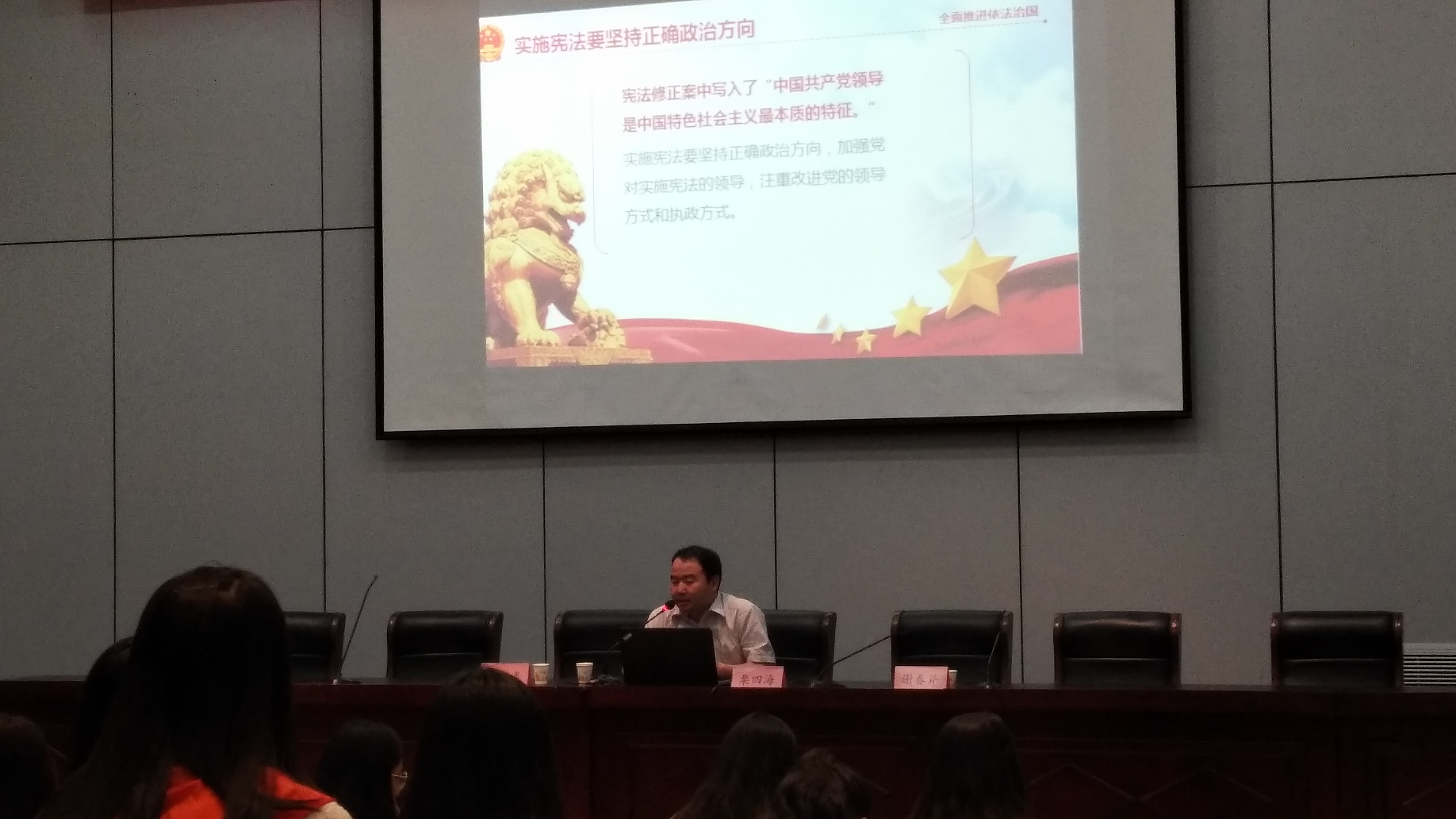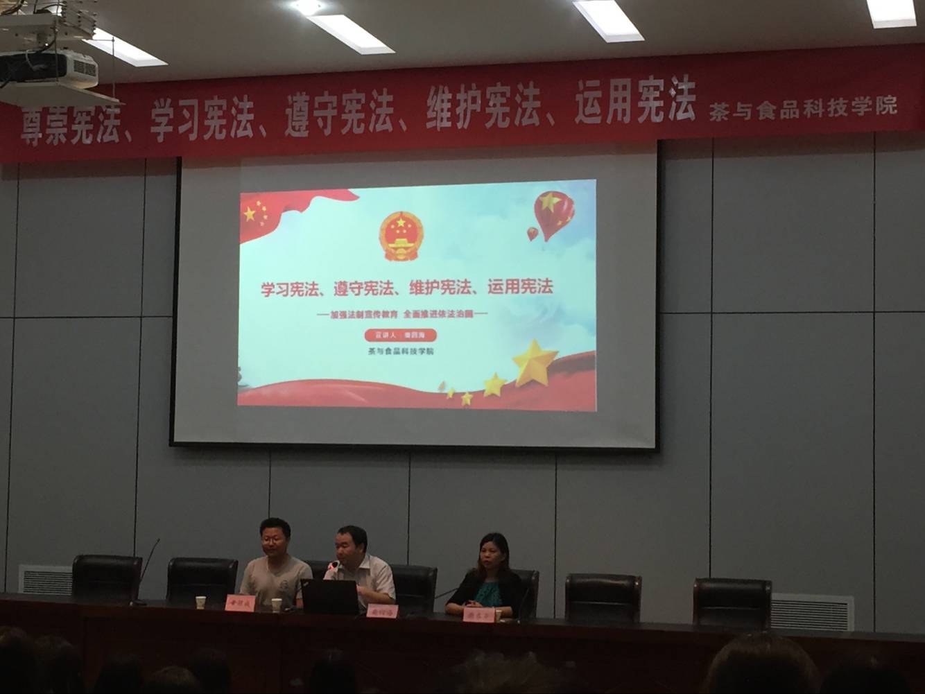 9月26日晚,茶与食品科技学院在研发楼报告厅举办了“学习宪法、遵守宪法、维护宪法、运用宪法”专题报告会。茶与食品科技学院党总支副书记谢春芹、辅导员及学生代表共126人听取了报告会。