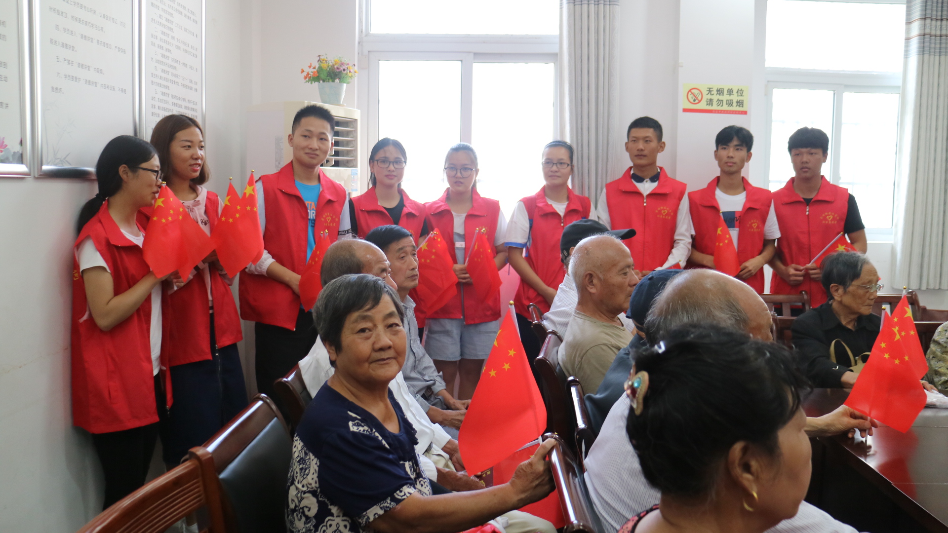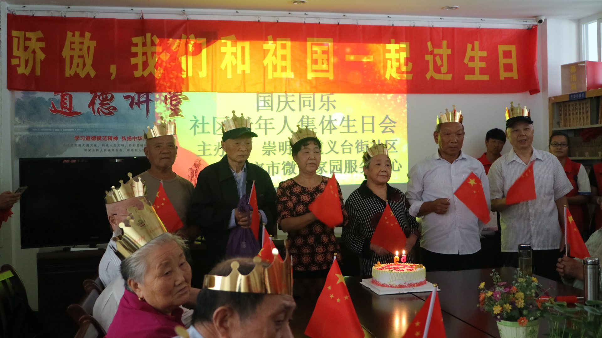 志愿者们将生日蛋糕送到老人们的面前,为老寿星们戴上了寿星帽,老人们开心地挥舞着手中的国旗感叹新中国带来的幸福晚景生活,与志愿者们边话家常边品尝蛋糕。志愿者们还带领老人们做手指操游戏,老人们笑得合不拢嘴。最后,活动在温暖动人的气氛中结束了。