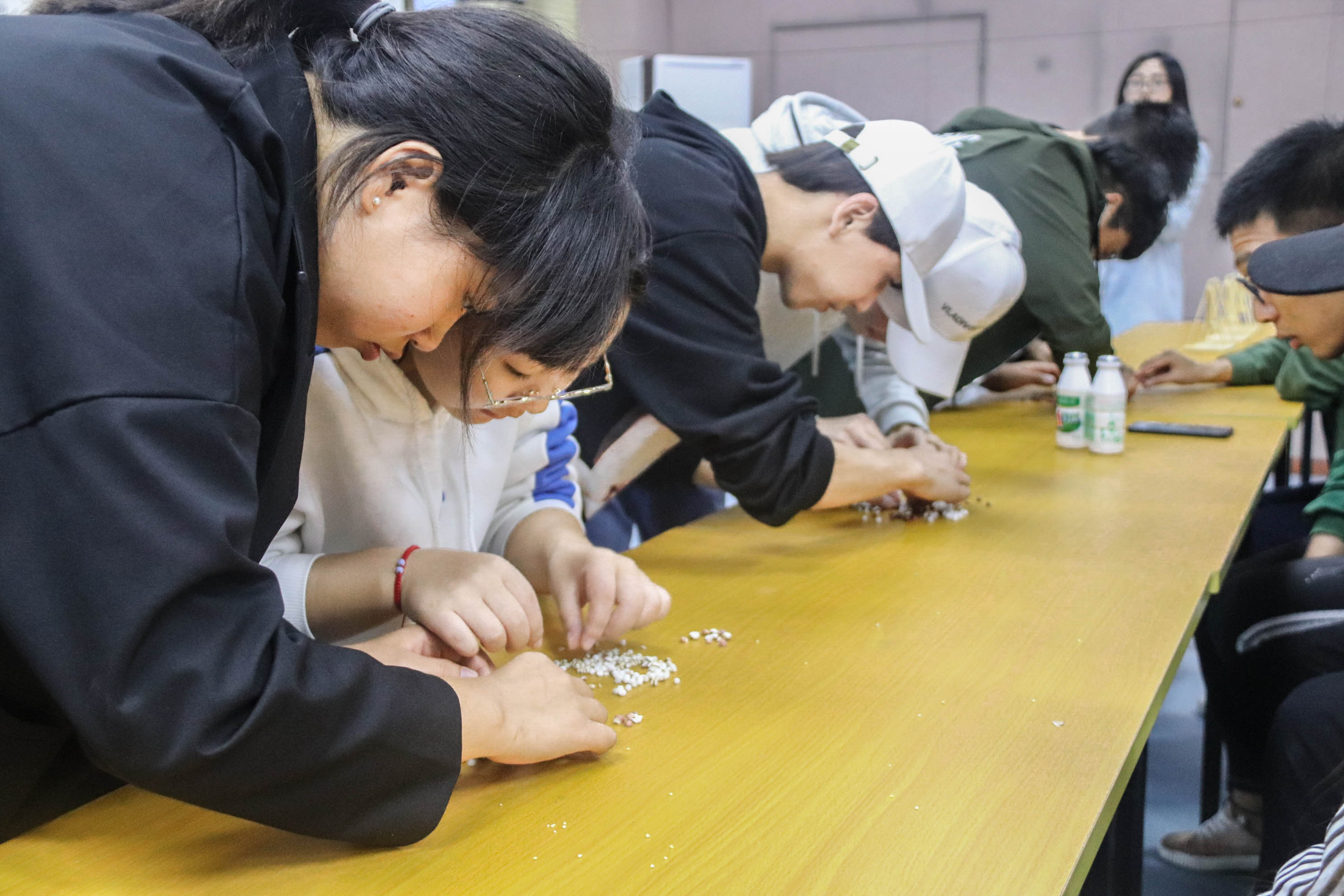 活动开始,由一段关于粮食的快闪视频带动了现场气氛,随后进入游戏环节,由现场观众自愿上台,面对红豆、薏米、小米、高粱、藜麦、燕麦、绿豆等十多种五谷杂粮,完成“快口出粮”、“眼疾手快”、“厨艺大比拼”游戏环节。最后,大家用准备好的五谷杂粮在展板上绘制粮食画并与展板合影留念,同学们纷纷表示一米一粟当思来之不易,爱粮节粮人人有责。