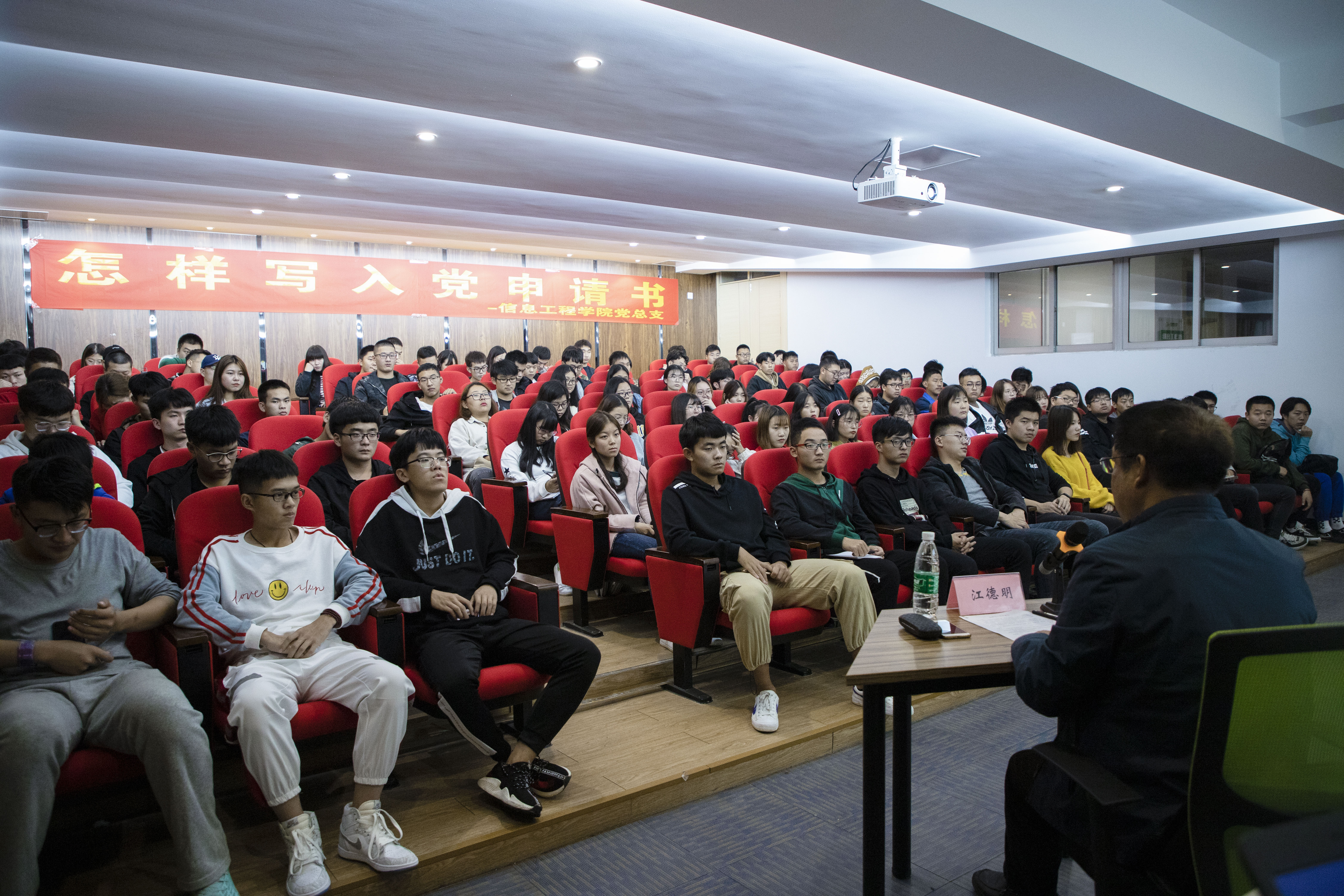 为加强新生理想信念教育,帮助他们正确撰写入党申请书,10月25日,信息工程学院党总支在创客空间307开展了“怎样写入党申请书”知识讲座。本次讲座由校工会江德明主席主讲,学院100多名新生参加了本次活动。
