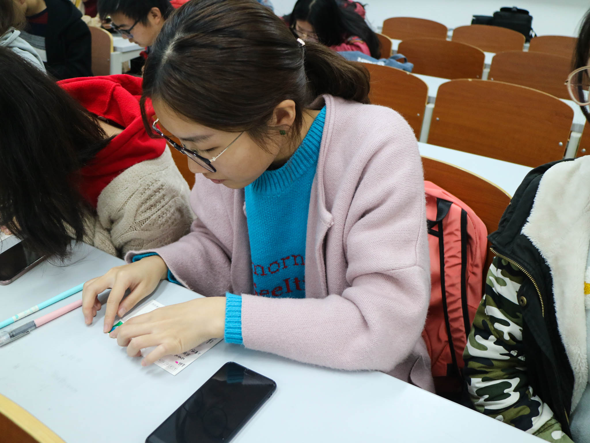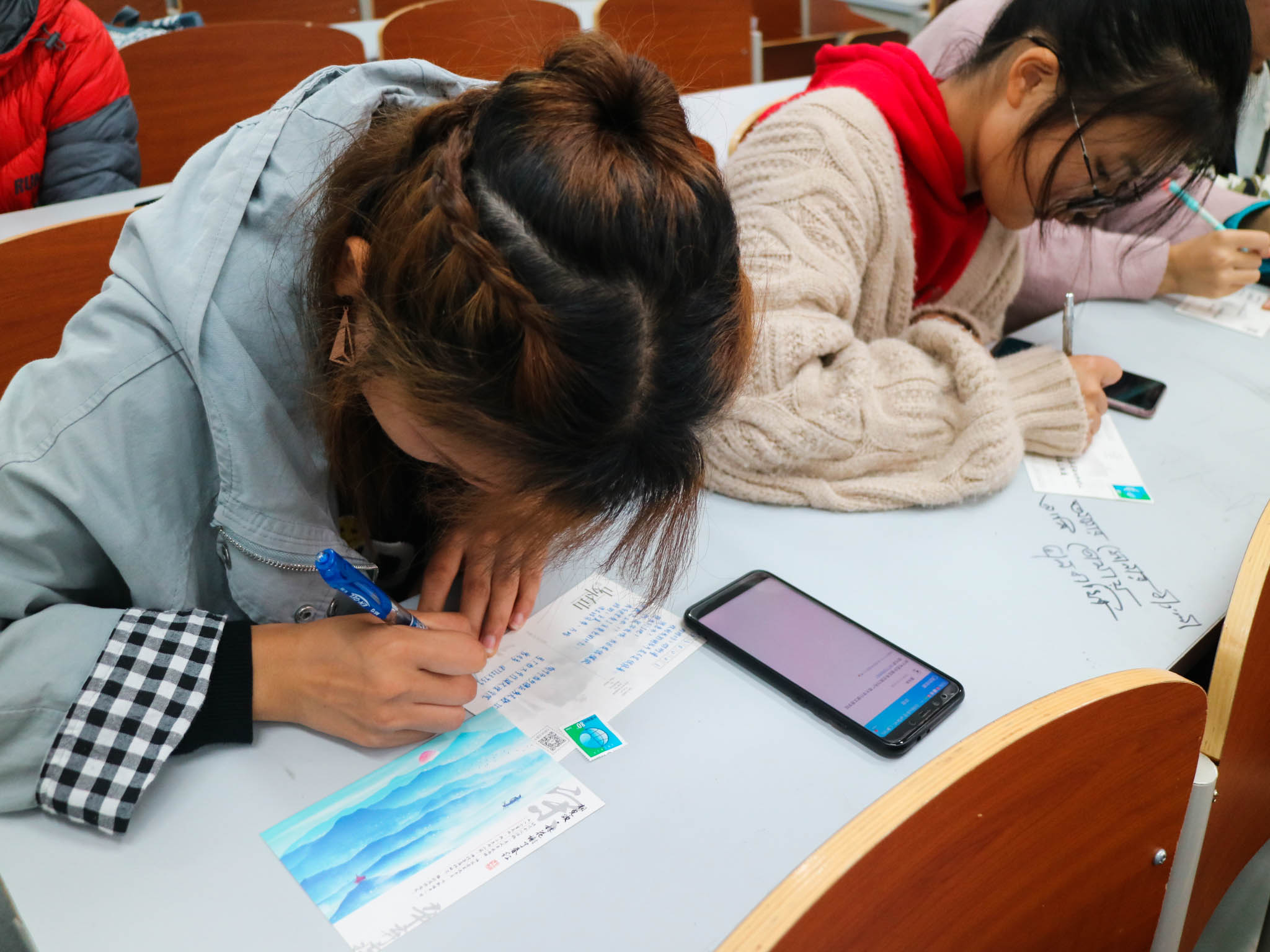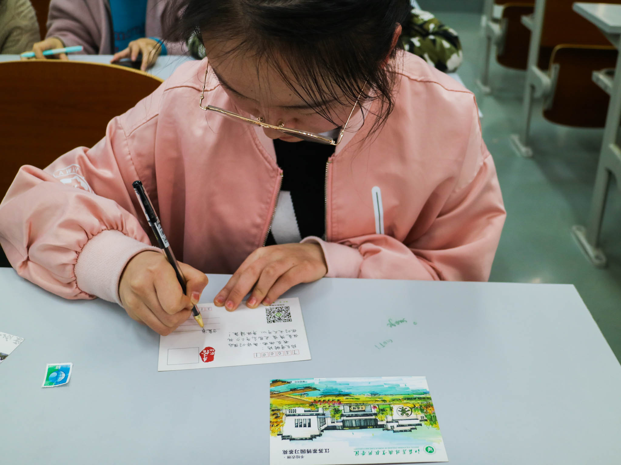 在“小小的卡片,长长的感恩”活动环节中,给远在家中的父母、亲朋书写一份告白、寄一份相思以示我们的感激,给远方的亲朋寄一张充满温暖和爱意的明信片。这些明信片是由同学们精心选取校园一景精心绘制而成,以同学们的实践动手能力感恩父母的辛苦、感恩朋友的帮助、感恩老师的辛劳,让大家用一颗感恩的心,用自己的实际行动去回报他们。