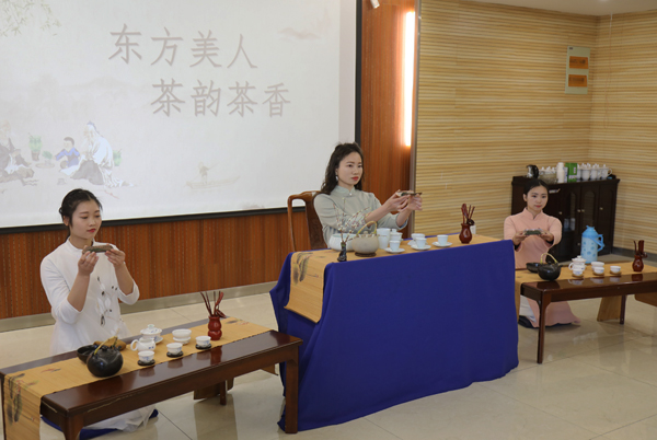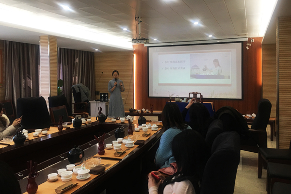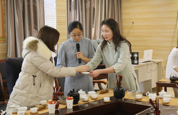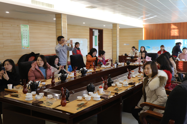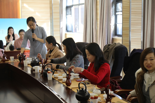 活动中,李园莉老师就泡茶的基本理论知识做了简单讲解,随后,伴随着悠扬的轻音乐,朱锦老师带领2名学生进行了现场泡茶演示。备器、煎水、赏茶、洁具、置茶、泡茶、奉茶、饮茶,在茶艺社团师生的带领下,团省委女职工观茶色,闻茶香,品茶味,大家兴致盎然地进行了茶文化知识的学习。