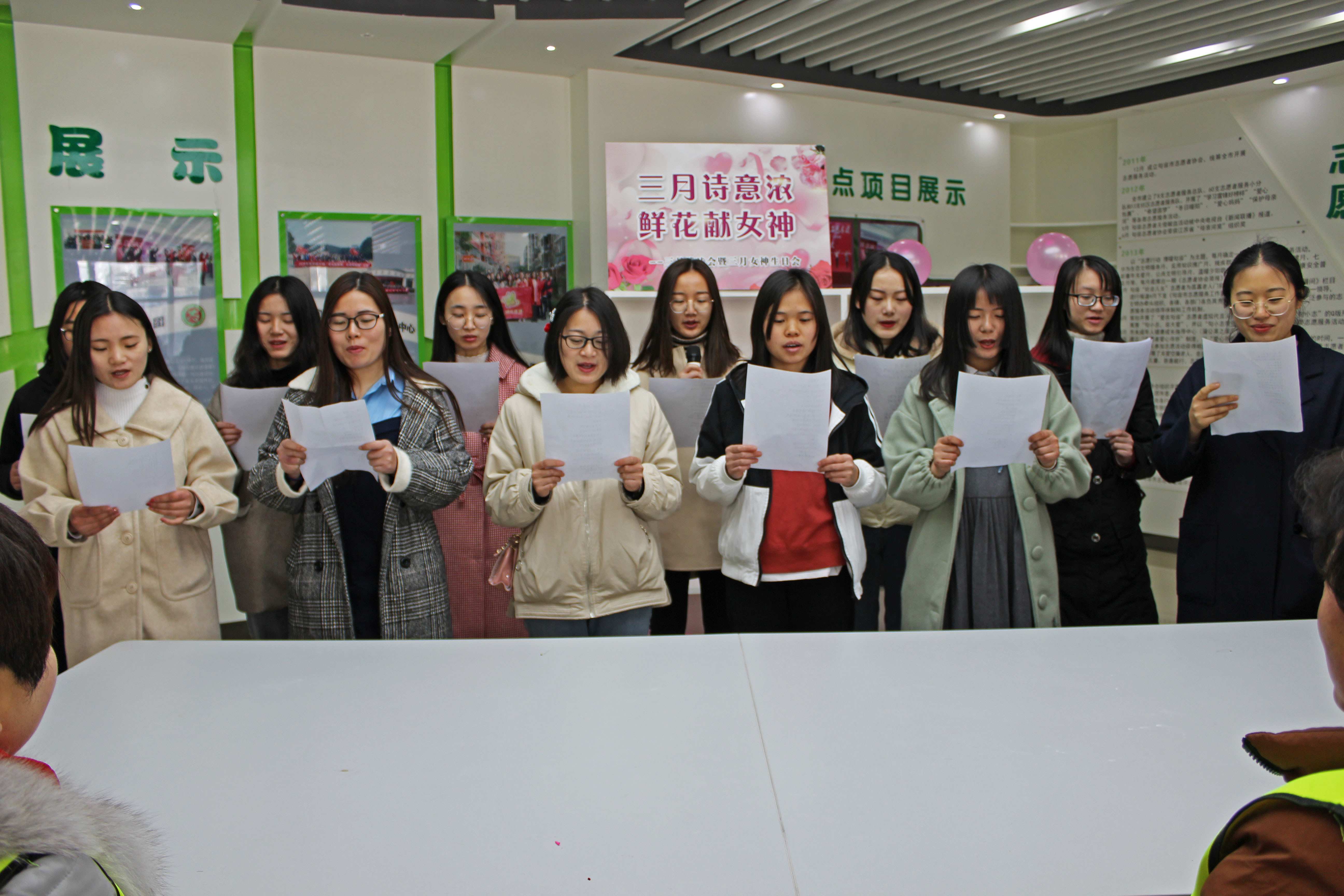 3月7日,志愿者们穿上可爱的卡通服在图书馆、教学楼、食堂为女生们送上“小仙女”发夹,为女生们跳一场欢快的舞蹈,最后送上自创的“土味情话”。3月8日,志愿者们来到句容志愿者之家为社区的资深女神们举办了生日会,志愿者和女神们互相朗诵了一首三月的诗赠予对方,共庆三八国际妇女节。