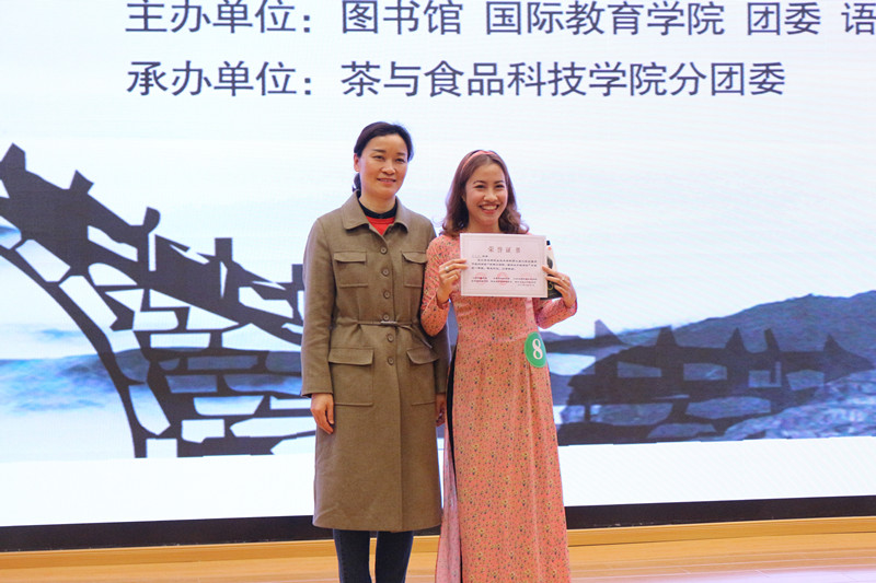 为弘扬中华诗词魅力,培养留学生学习汉语的兴趣,提高留学生汉语运用能力,4月26日,第九届大学生读书节系列活动之“诵古今经典 享诗词之美”汉语桥留学生诗词会在图书馆报告厅成功举办。此次活动由图书馆、国际教育学院、校团委、语委主办,茶与食品科技学院团委承办,来自国际教育学院的12名留学生参加了本次诵读大赛。