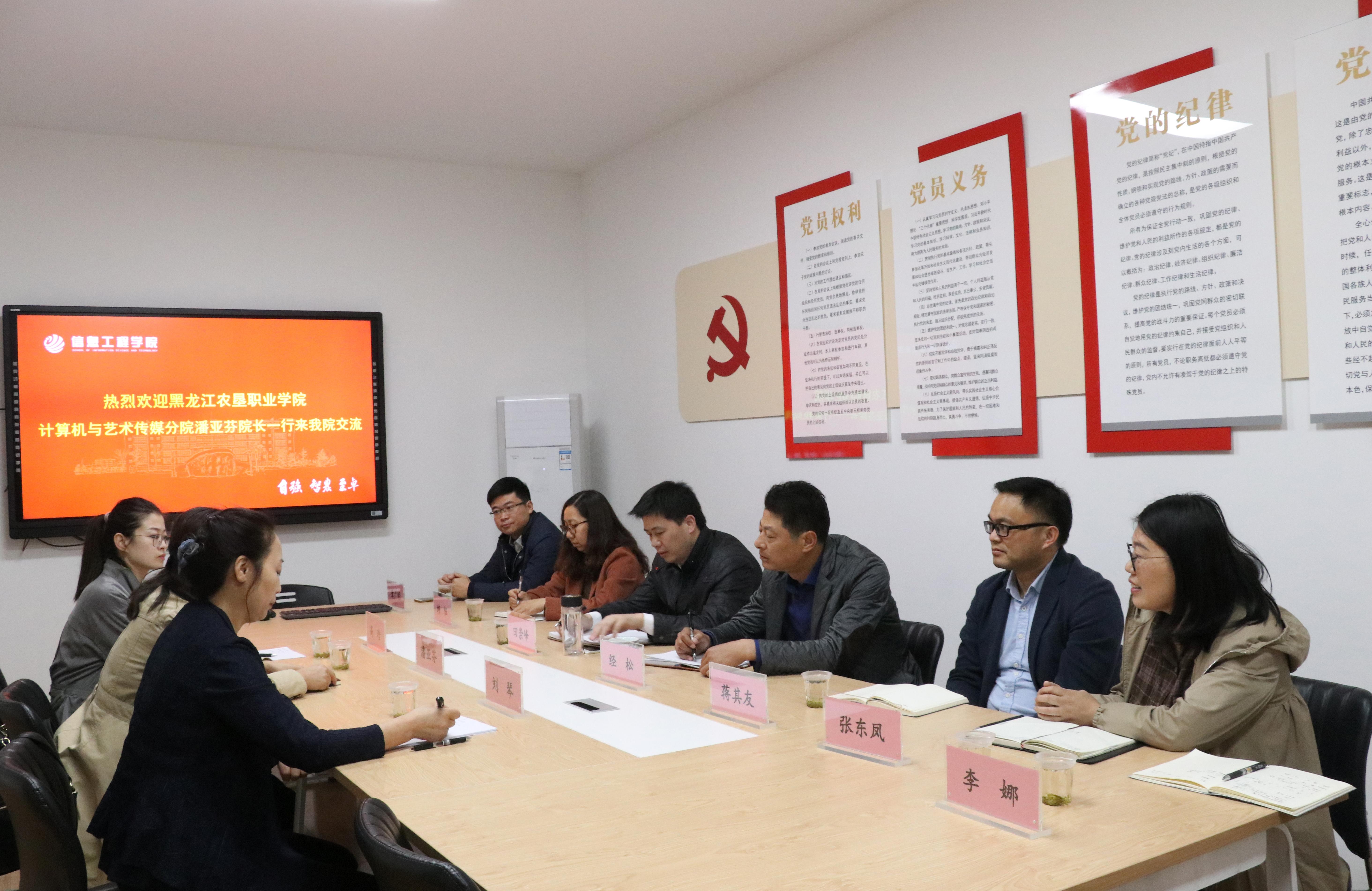 4月26上午,黑龙江农垦职业学院计算机与艺术传媒分院潘亚芬院长一行三人来信息工程学院调研交流,该院相关负责人和专业教师参加了座谈会。
