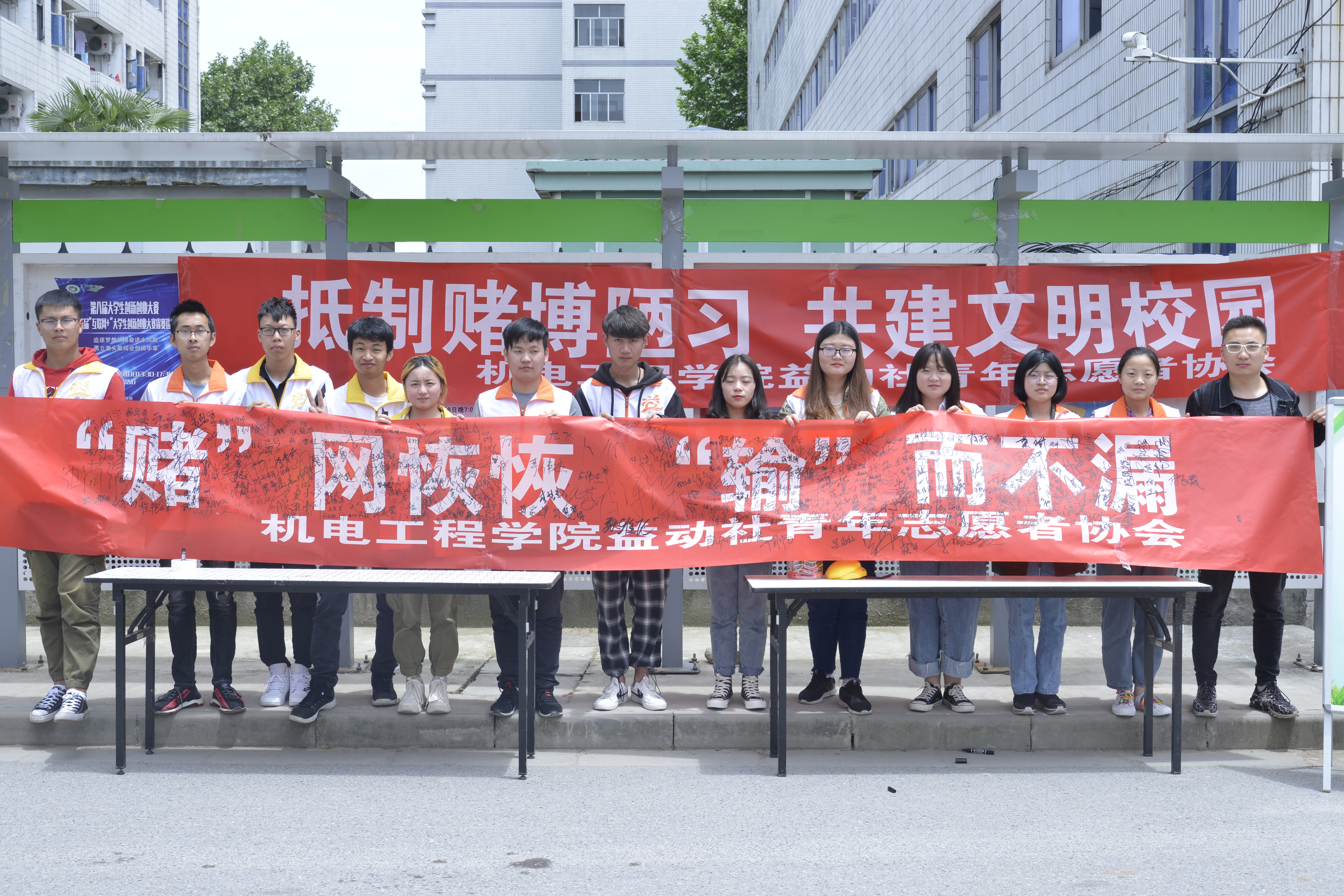 为了提高学生的警惕意识,认清赌博危害,抵制赌博行为,共同构建平安、文明、法治校园,5月8日,机电工程学院在食堂广场举办“拒绝赌博陋习,共建文明校园”宣传活动。