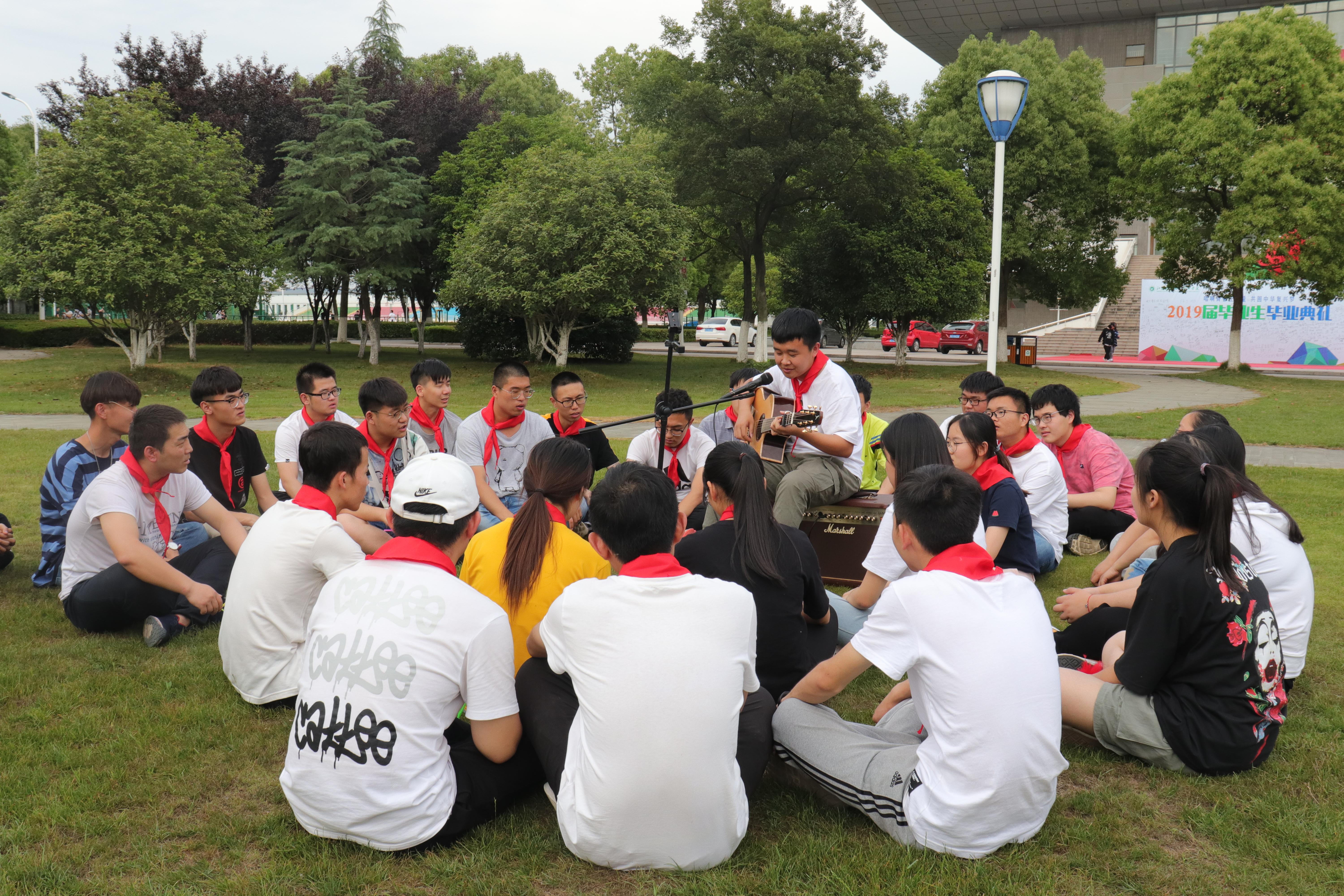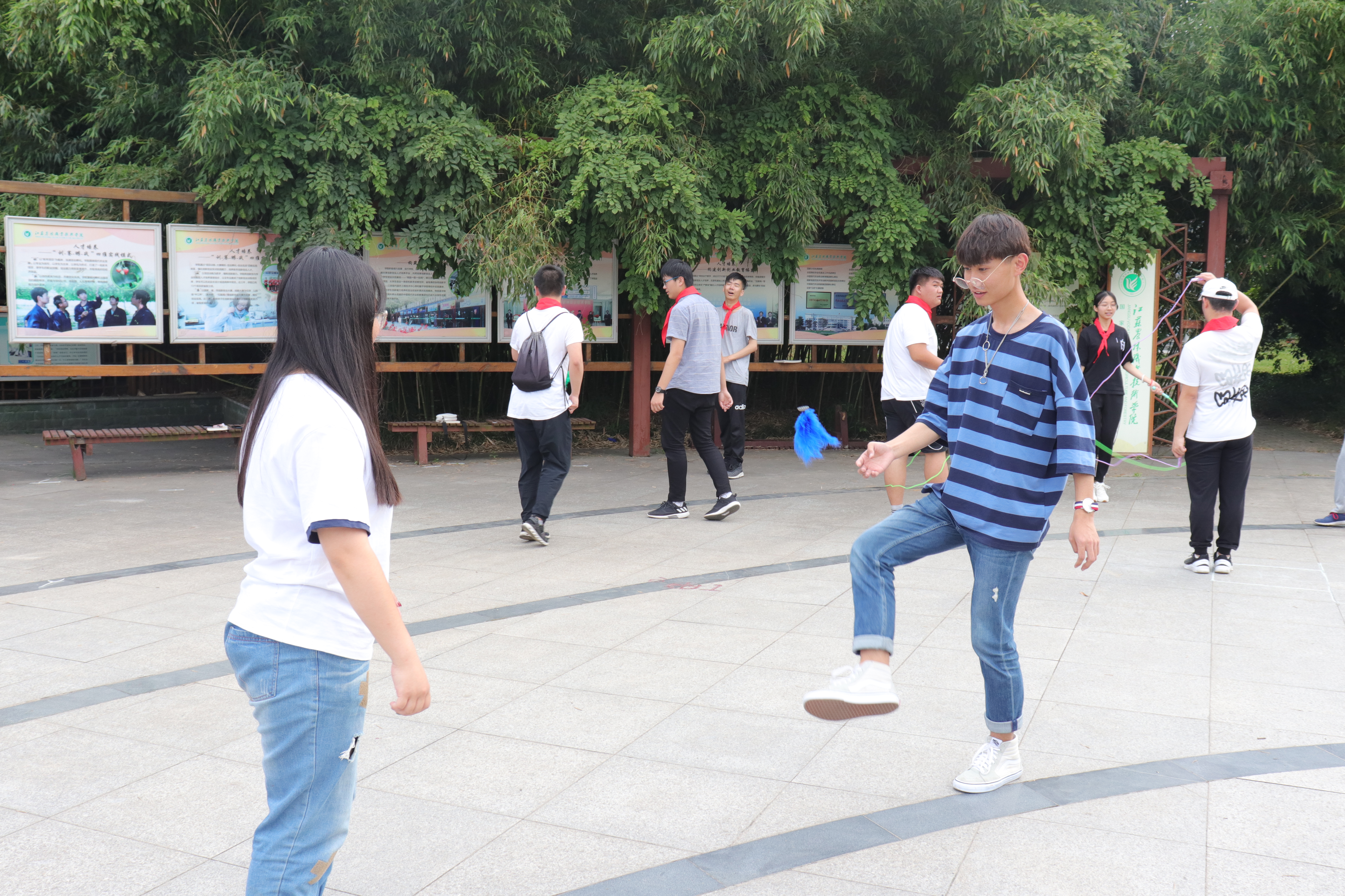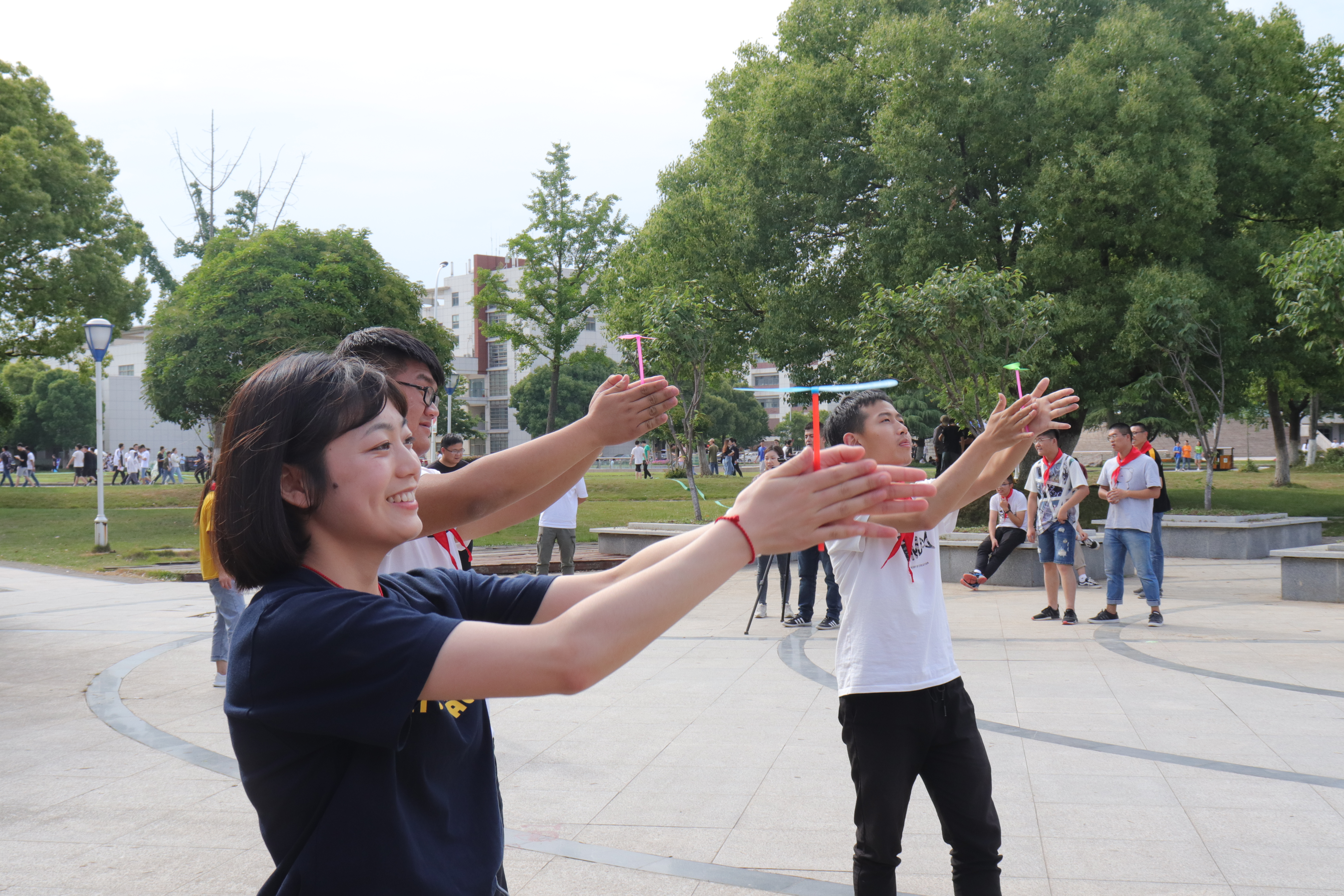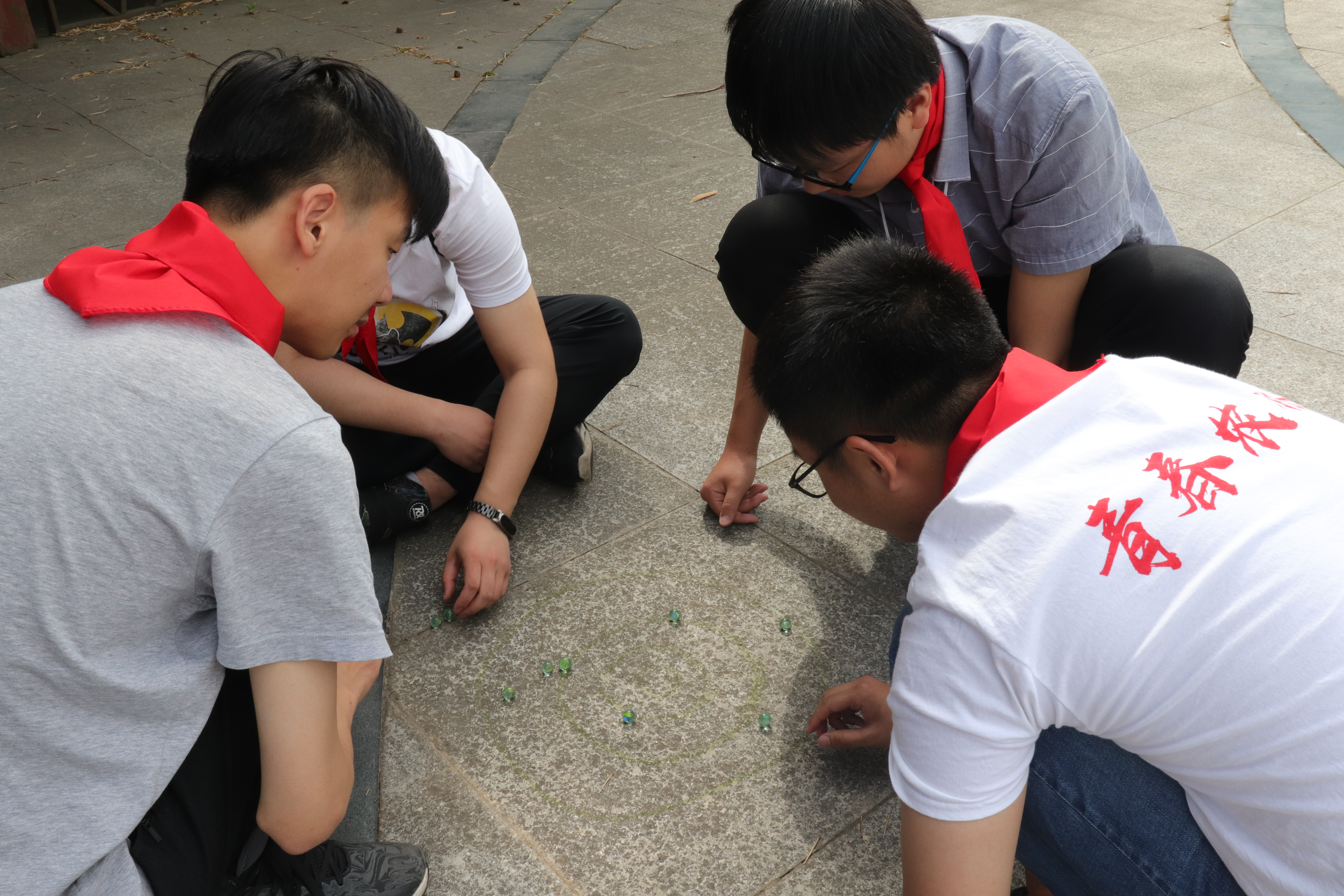 现场设置了跳房子、丢沙包、跳绳、踢毽子、竹蜻蜓、打弹珠及打元宝等7项游戏,同学们三两成群,有的比赛跳绳,有的对踢毽子,有的一起放飞竹蜻蜓,还有的围在一起打弹珠。大家在游戏中回忆童年无忧无虑的时光,在活动中感受青春的美好。一张张阳光灿烂的笑脸,一阵阵清脆爽朗的笑声,欢乐围绕在每个人身边。最后大家围坐在草坪上一起唱着《童年》,一起回忆儿时的点点滴滴,现场气氛温馨而美好。