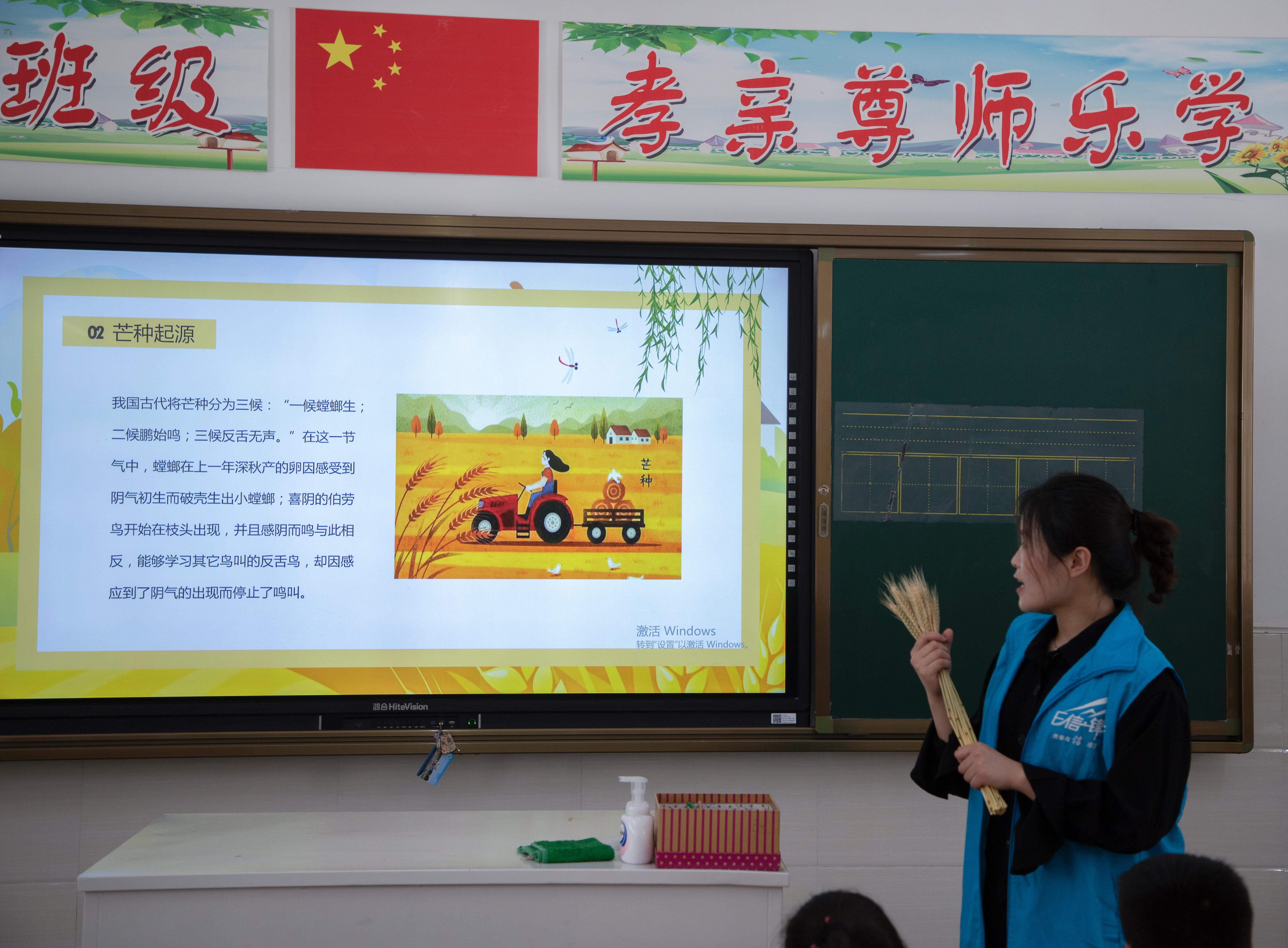 在芒种节气到来之际,信息工程学院组织学生志愿者于6月4日走进句容市崇明小学文昌校区,给一年级的小朋友们上了一堂生动有趣的芒种节气课。