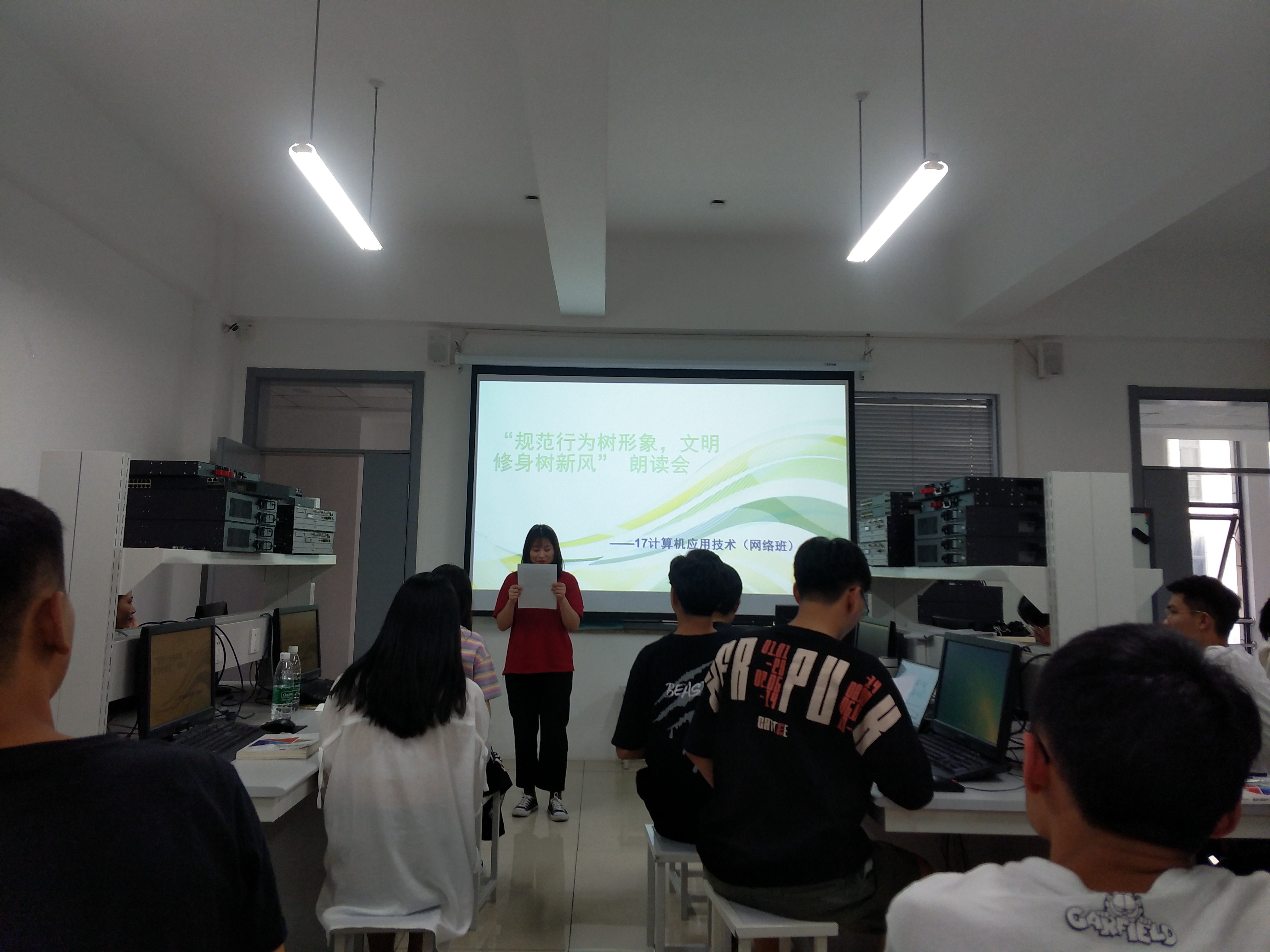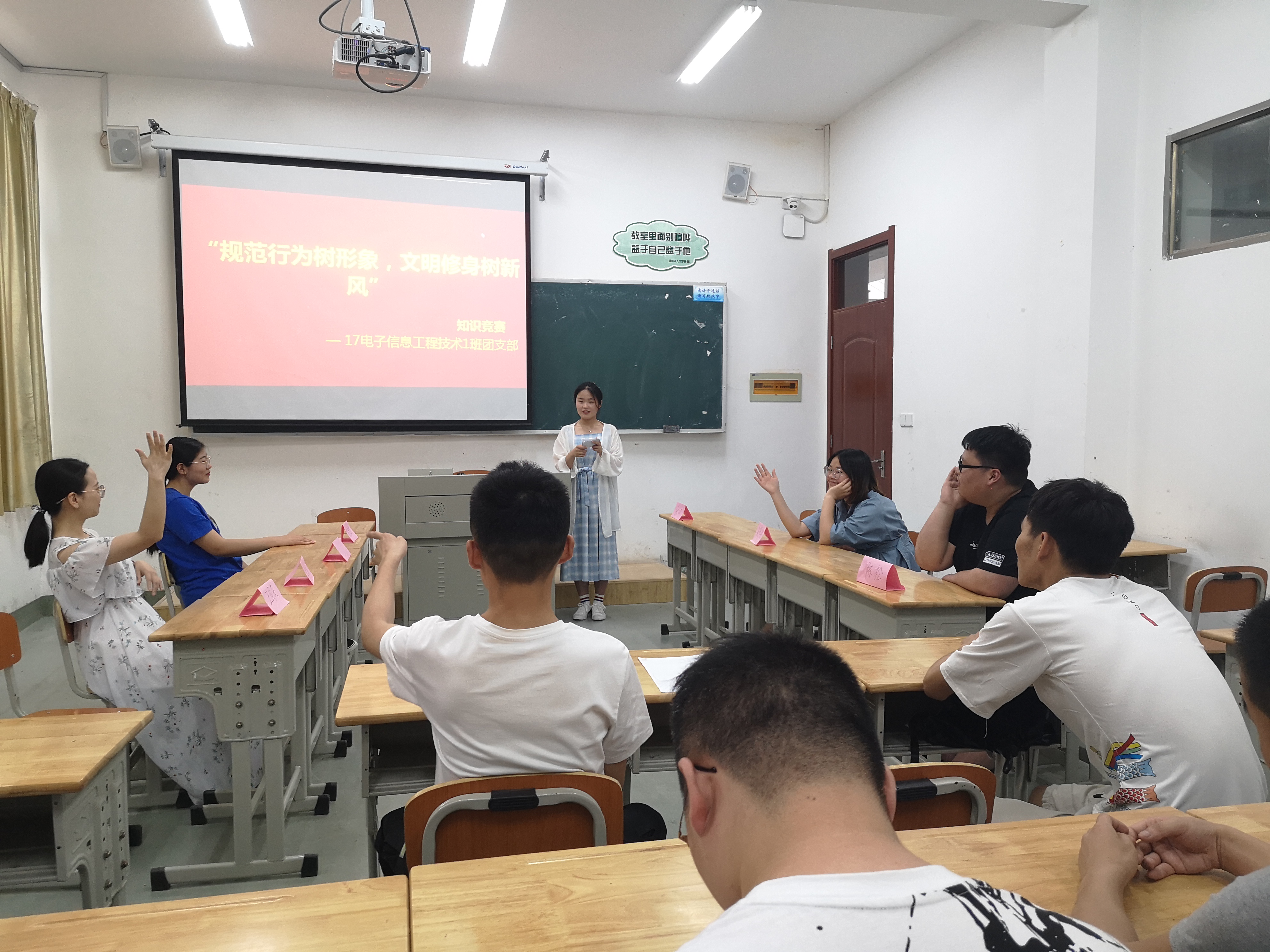 活动期间,各团支部精心准备,围绕主题,开展了形式多样的主题团日活动。17计算机应用技术软件班开展的《话说礼仪》活动中,团支部书记声情并茂地介绍礼仪的内涵,帮助同学们进一步认识文明礼仪对学习生活的重要意义。17电子信息技术2班团支部开展的《树文明新风尚》朗诵活动中,参赛选手慷慨激昂地诠释道德的具体含义,引导同学们树立正确的世界观、人生观、价值观;其他支部以知识竞赛、辩论赛等形式,以传递文明为主线,号召同学们以实际行动践行文明行为,争做“四有”大学生。