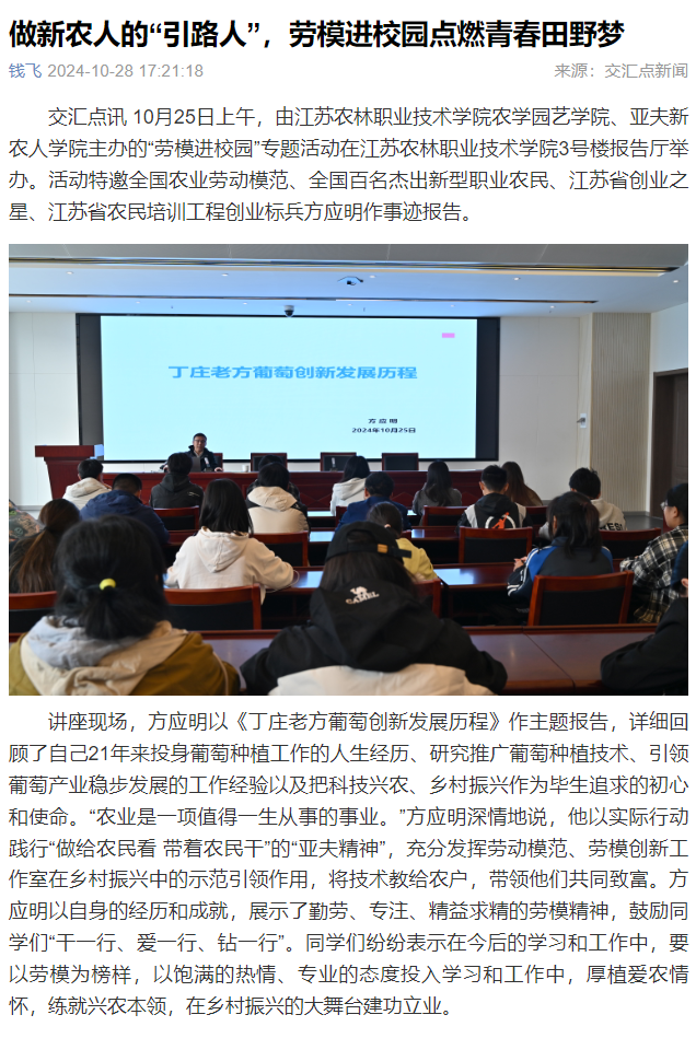 【交汇点】报道永利官网“劳模进校园”专题活动。